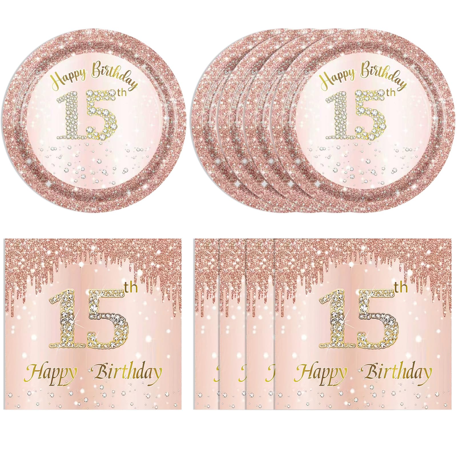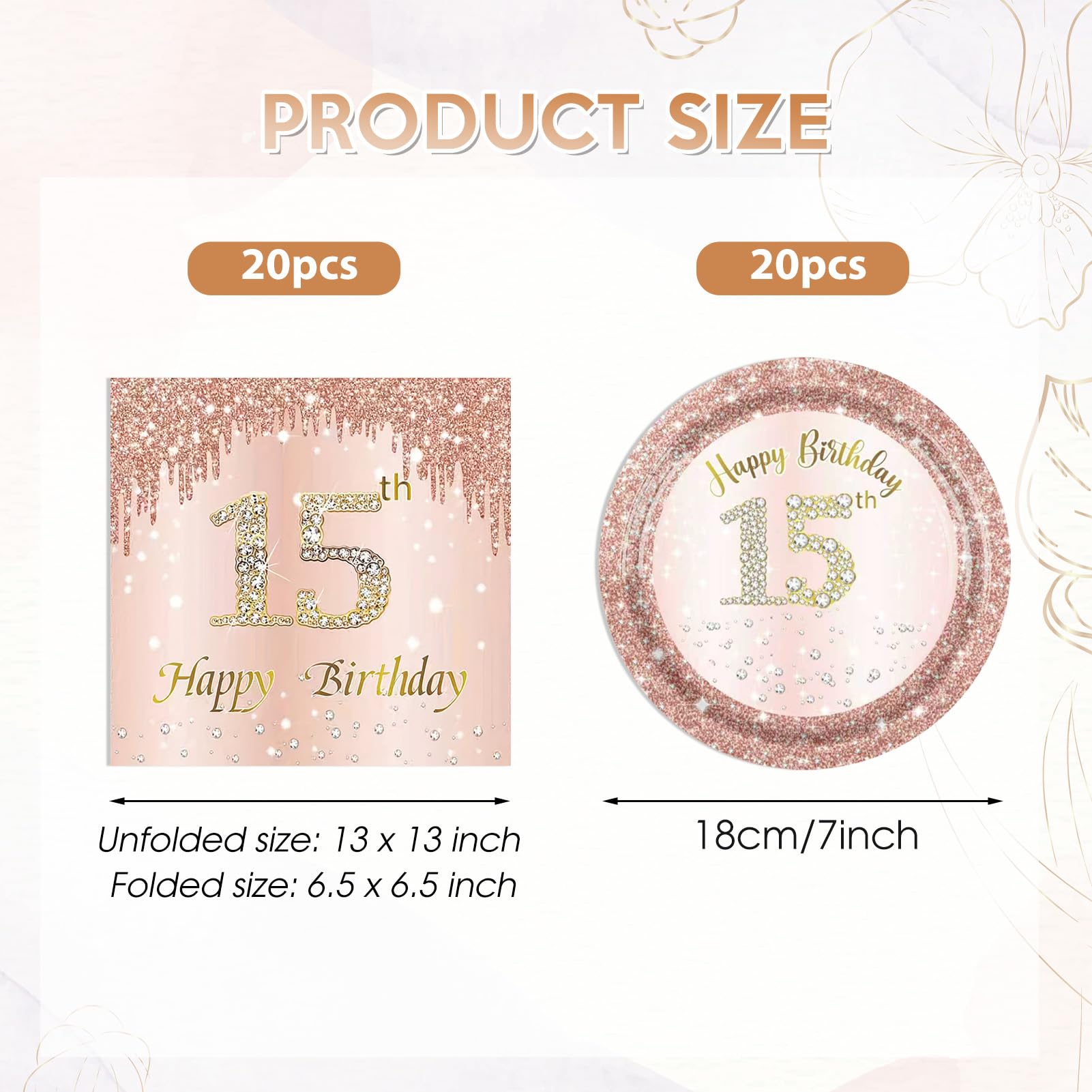 40PCS 15 Birthday Decorations for Girls: You will receive 40Pcs sweet 15 birthday decorations set,Including 20 pieces 7'' rose gold happy birthday party plates and 20 pieces 6.5'' 15th birthday napkins each set that can serve 20 guests. High-quality tableware with vibrant designs adds excitement to your party setup