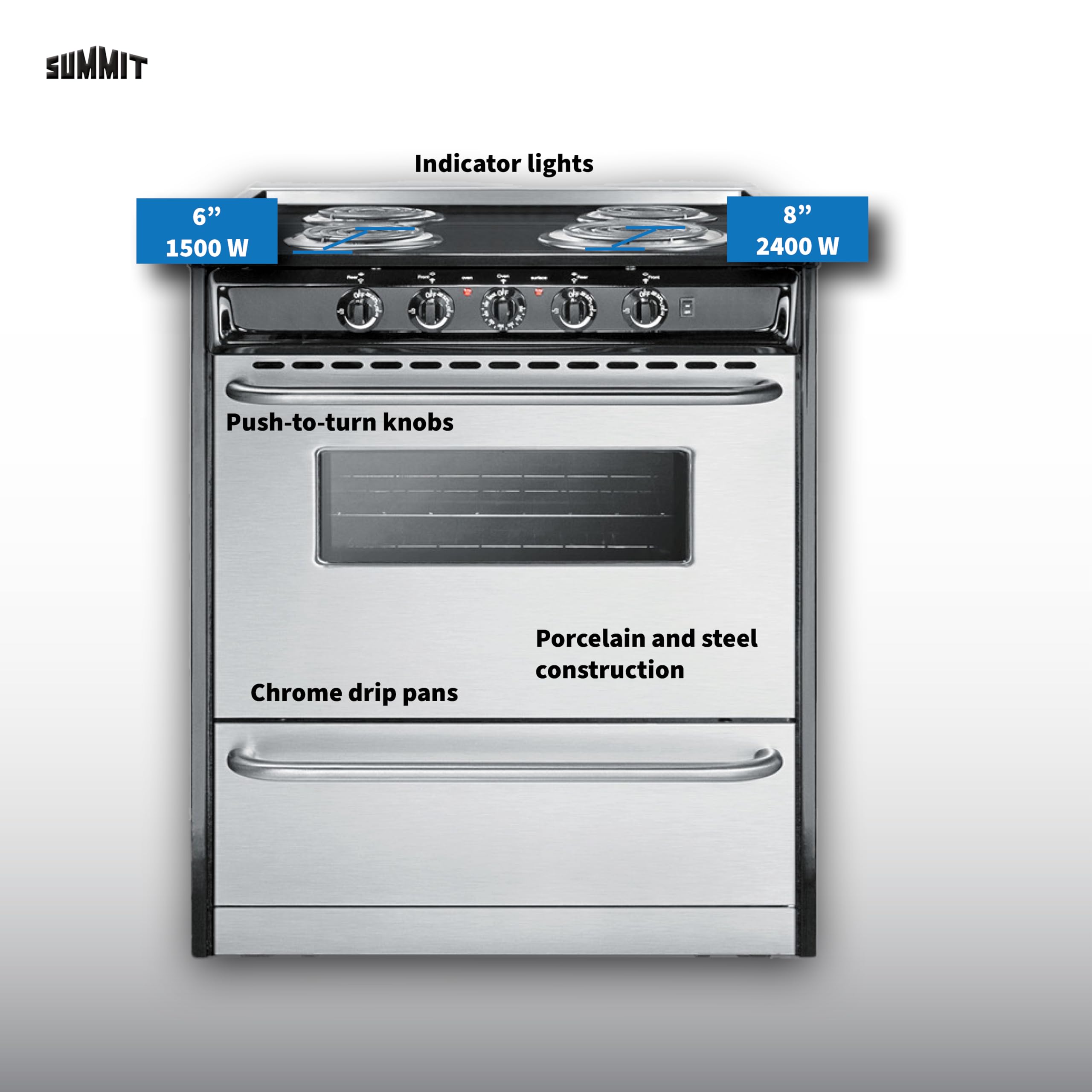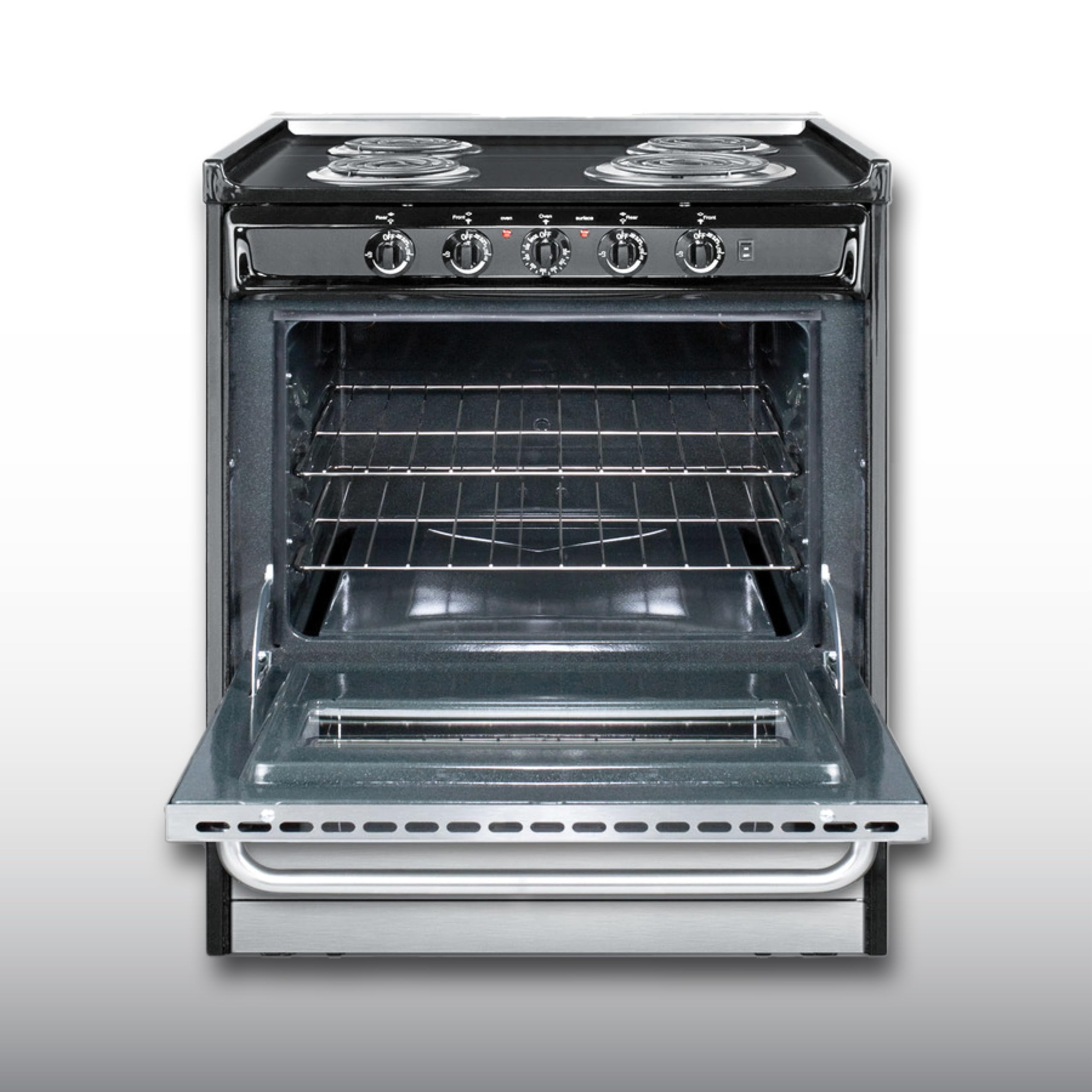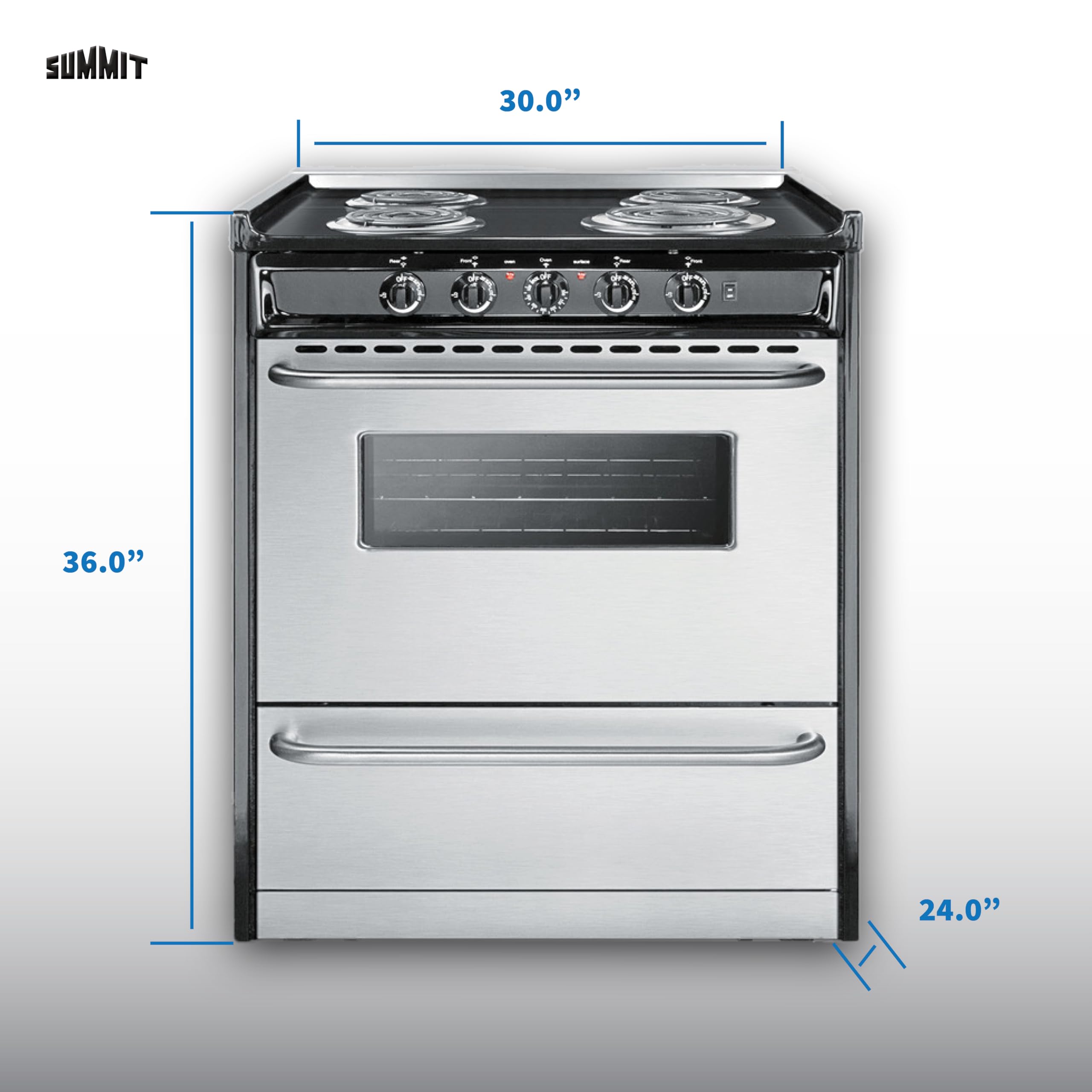 The perfect electric range for a small space without losing functionality: Perfectly sized at 30” wide and a depth of 24”, perfect for most home kitchens. This unit features one 8" 2400W and three 6" 1500W coil elements with a 3.7 cu.ft. oven interior that can accommodate large trays.