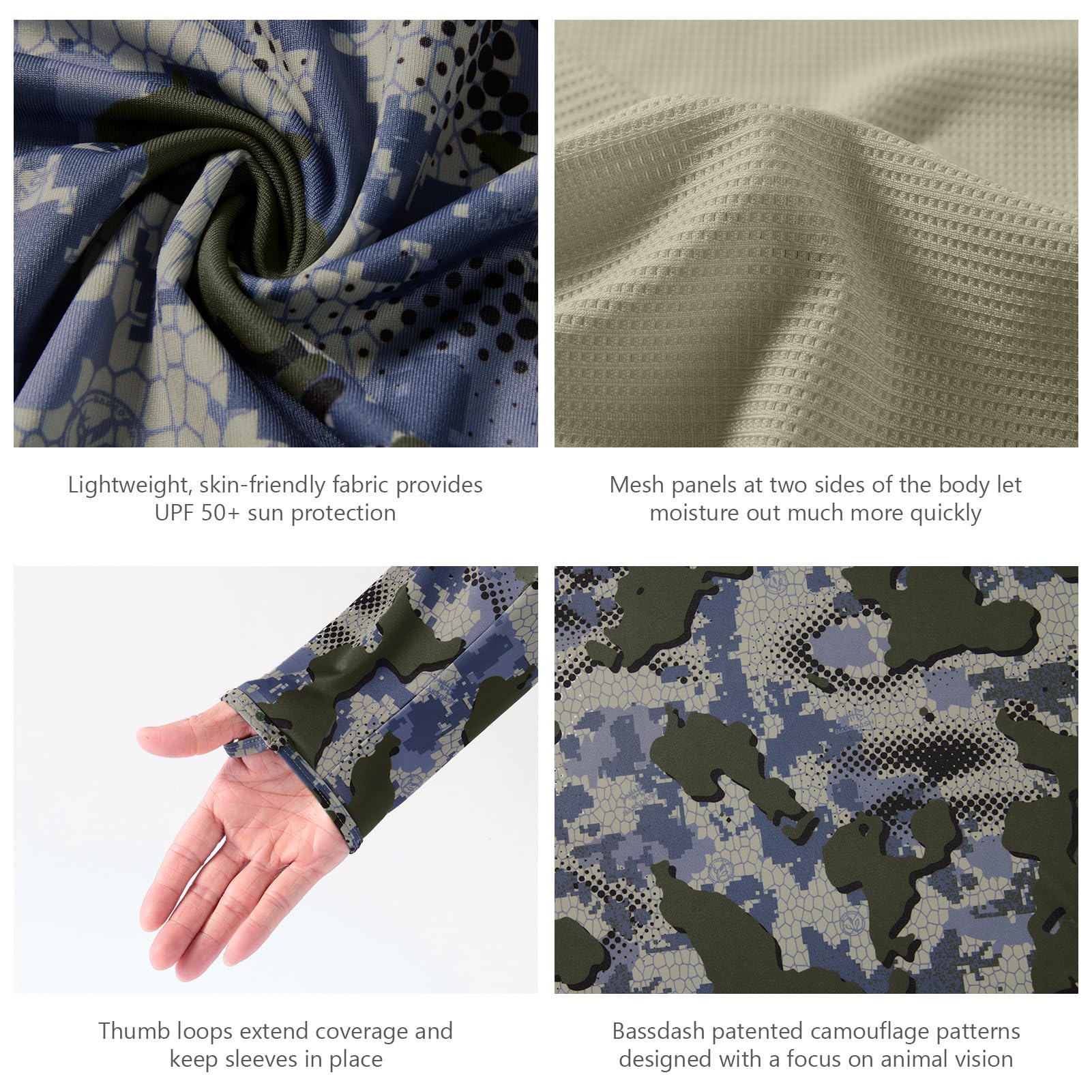 Bassdash patented camouflage patterns designed with a focus on animal vision can well break up your outline at any distance, help you take on the appearance of different surroundings and go undetected