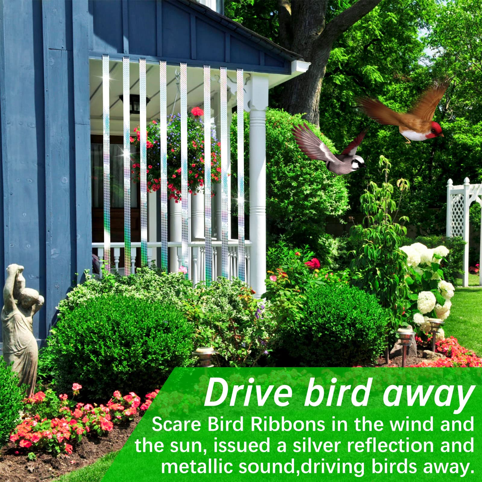 Effective Birds Scare Reflective Ribbon: Keeping birds off your home and your crops and your decors and everthing on your farm or garden,no more troubles from them(Pigeons, Hawk, Woodpeckers, Geese etc), giving your a quiet life.