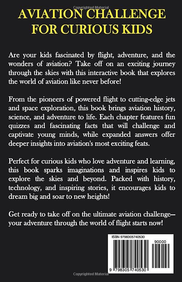 Is your child fascinated by airplanes, daring pilots, and the marvels of flight? Take off on an extraordinary adventure with Aviation Challenge for Curious Kids! This interactive book is packed with 15 captivating chapters, each featuring 20 quiz questions for a total of 300 questions to challenge and inspire young minds. Here’s what makes this book unique: Explore diverse topics: From the Wright brothers' first flight to the cutting-edge technology of stealth fighters, and even the connection between aviation and space exploration. Detailed solutions: Each quiz answer includes fascinating explanations to deepen your child’s understanding and keep their curiosity soaring. Did You Know? Sections: Fun and surprising aviation facts at the end of every chapter to spark imagination and encourage further learning. Beautiful illustrations: Engaging visuals bring the world of aviation to life, keeping kids entertained and eager to turn the page. Your child will learn about legendary planes like the Spitfire and Concorde, explore the science behind flight, and discover how aviation paved the way for space exploration. This book turns learning into a high-flying adventure, blending history, technology, and fun challenges. Perfect for kids aged 8-12, this book is designed to educate, entertain, and inspire future aviators, engineers, and adventurers. Whether they’re solving puzzles, reading fun facts, or marveling at the illustrations, this book will keep them engaged for hours. Parents, this is more than just a book—it’s a journey through the skies. Order now and let your child explore the wonders of aviation with 300 exciting challenges and a sky full of inspiration!
