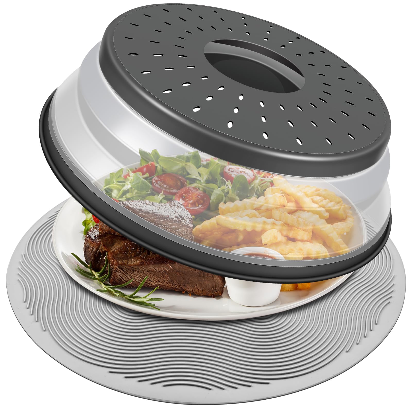 【Perfect Match】LekDrok Microwave Food Cover and Mat 12", Mat as Bowl Holder to Grab Food immediately. Cover to Keep clean microwave top and 4-sides. Mat to keep clean glass turntable. And with the mat, no burning, no Waiting.