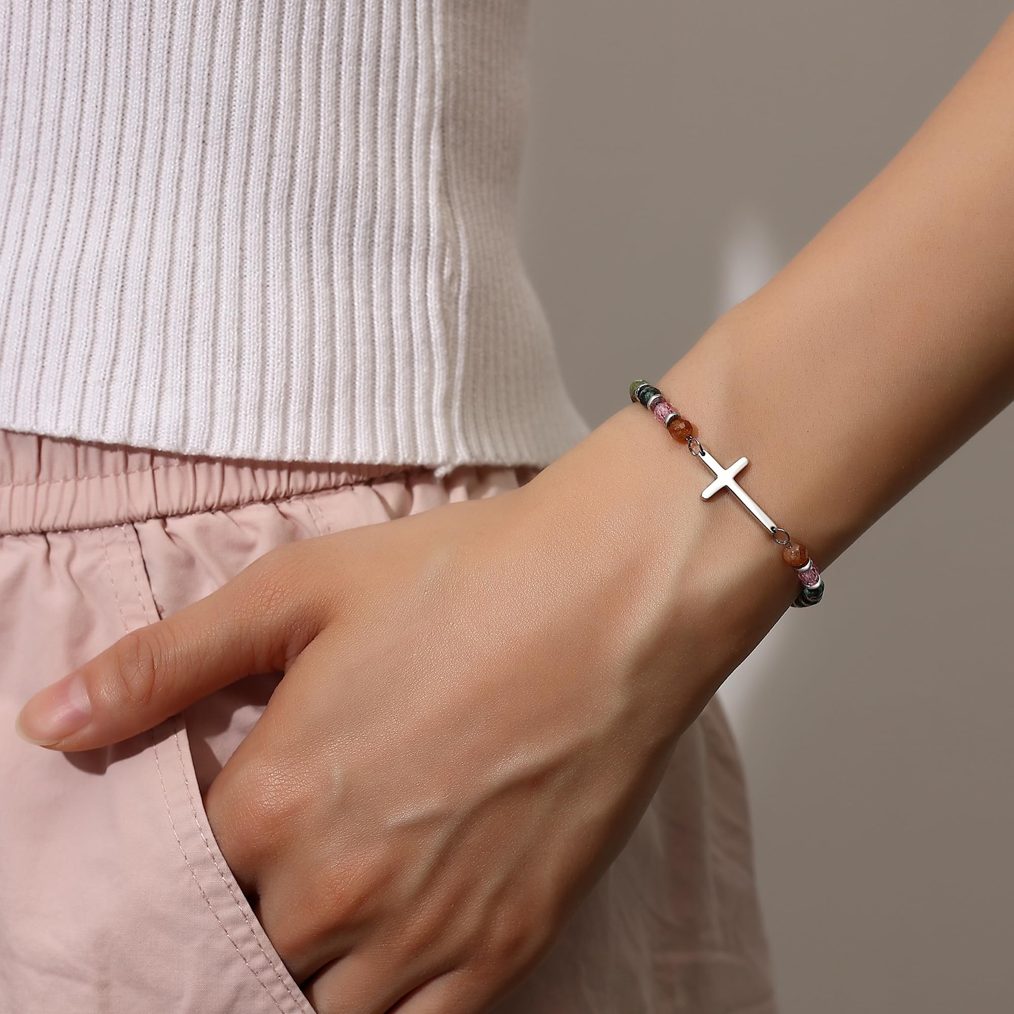 【 Premium Quality & Comfort Fit 】Crafted for comfort and durability, this 7.4" beaded cross bracelet for women features a 1.5" extension chain for an adjustable fit (6.5"-8" wrists). Handmade with 4mm earthy-toned natural stones and hypoallergenic 316L stainless steel beads, it’s lightweight, tarnish-resistant, and perfect for daily wear.