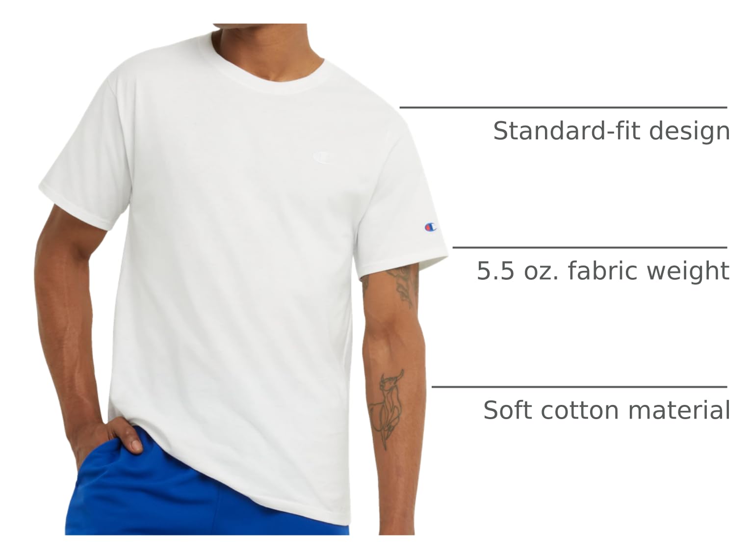Description TIMELESS THREADS. Add lived-in comfort to your daily rotation with this T-shirt for men, expertly crafted from a soft cotton or cotton blend. Cut for a standard fit, it's detailed with a shape-holding ribbed crewneck, short sleeves, and matching back neck tape for no-irritation comfort. This classic men's T-shirt style is a must-have that pairs well with sweats and shorts for a rounded-out sporty look. Finished with the iconic C logo patch embroidered at the chest for an authentic look.