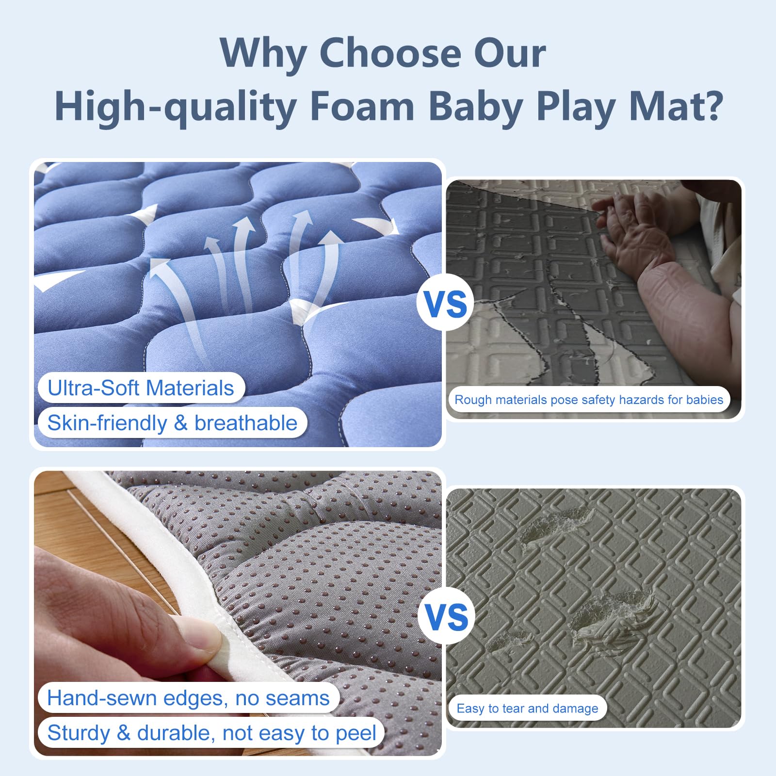 Safety and Non-slip: The non-slip design on the bottom of the baby play mat ensures stability and safety during playtime, providing a safe place for your kids to romp around. Our floor playmates meets US CPC certification and regulations and passes phthalate, lead, and toxicity tests. So you can trust that our product is safe for your little one