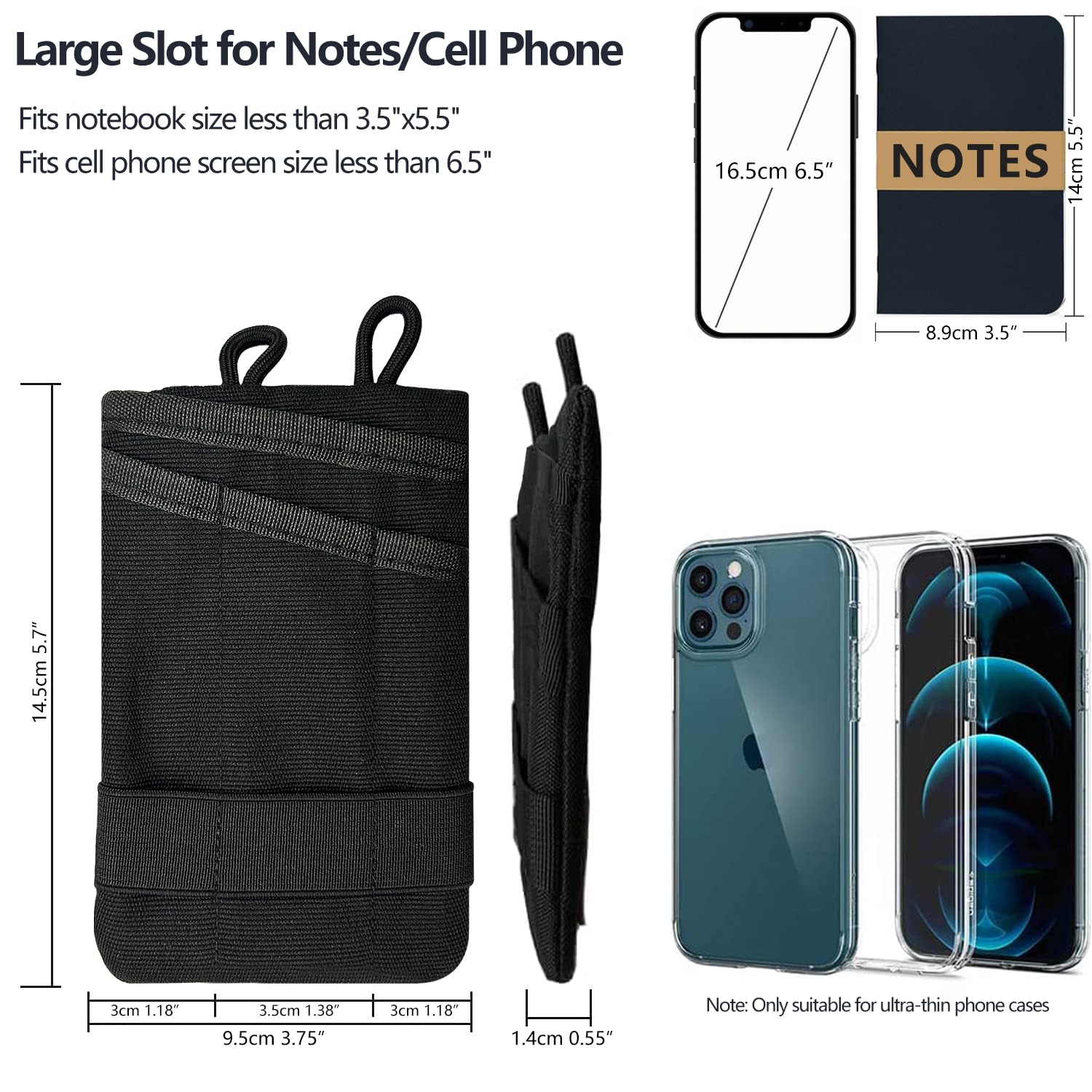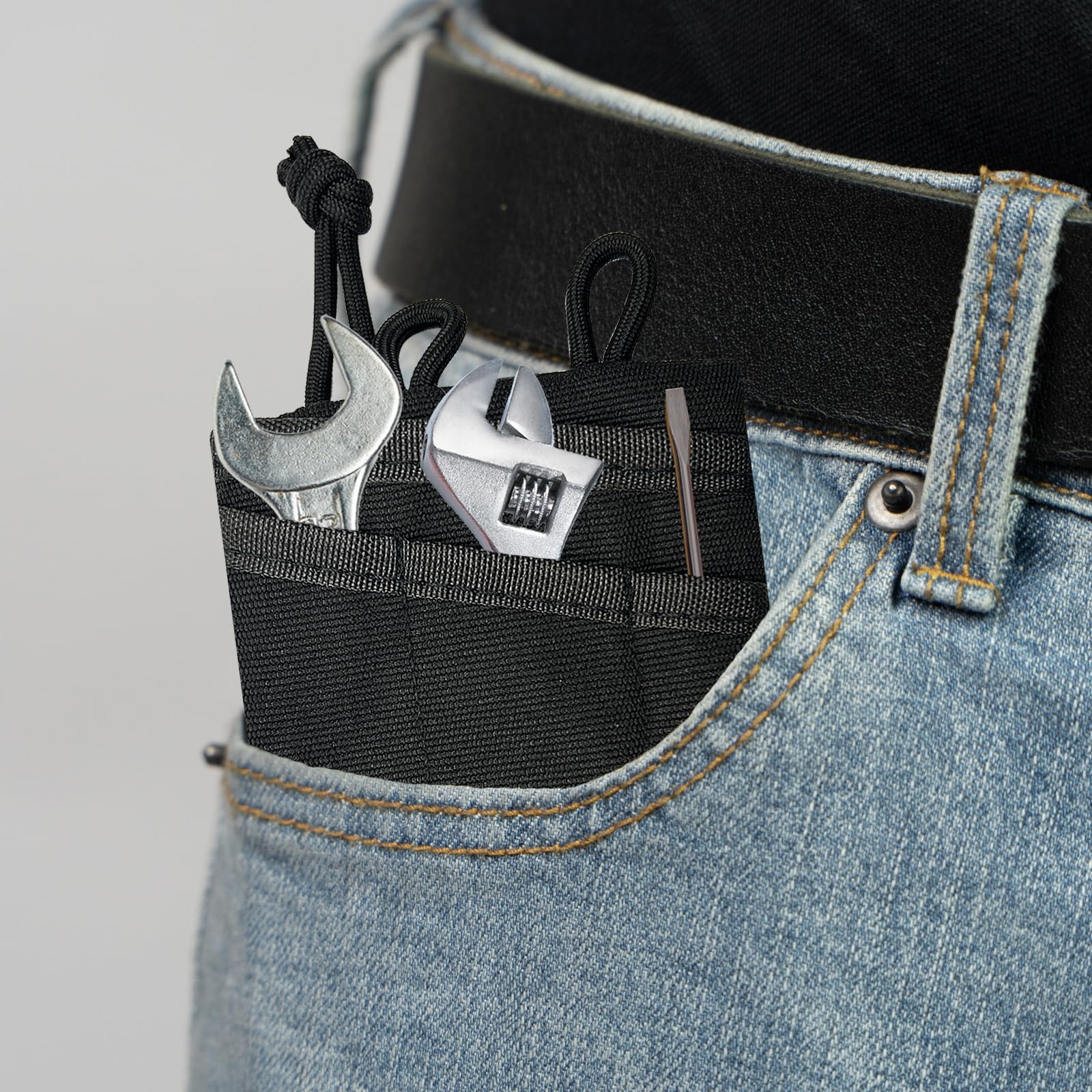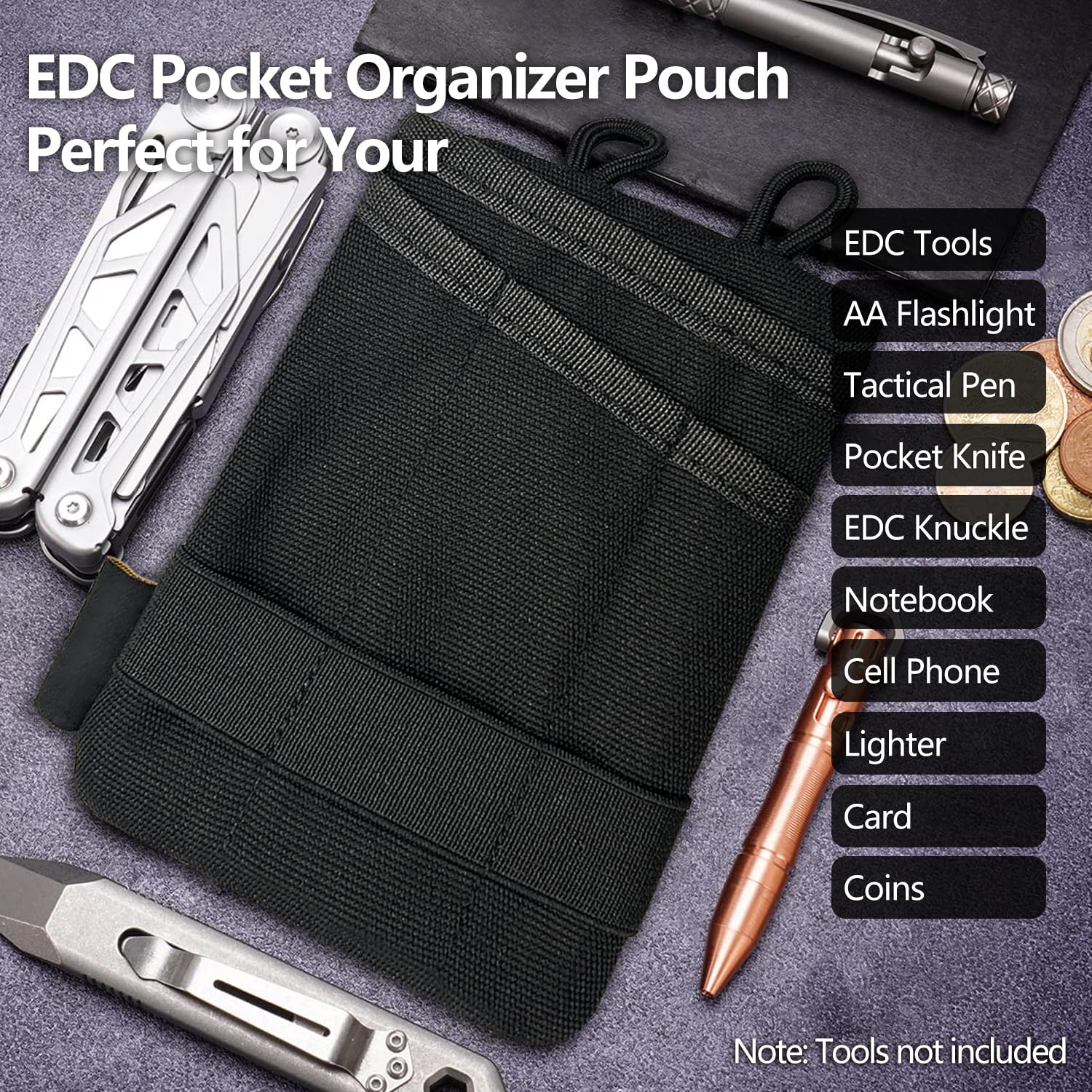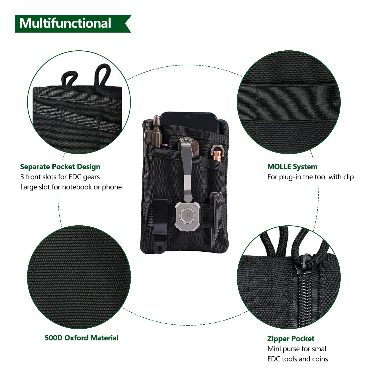 Efficient Organization: 3 front slots for EDC gear, 1 large slot for mobile phone or notebook, 1 zippered pocket for your coins, change, ID cards to keep your essentials neatly arranged. Easily store and access your tools without the hassle of tangled or misplaced items