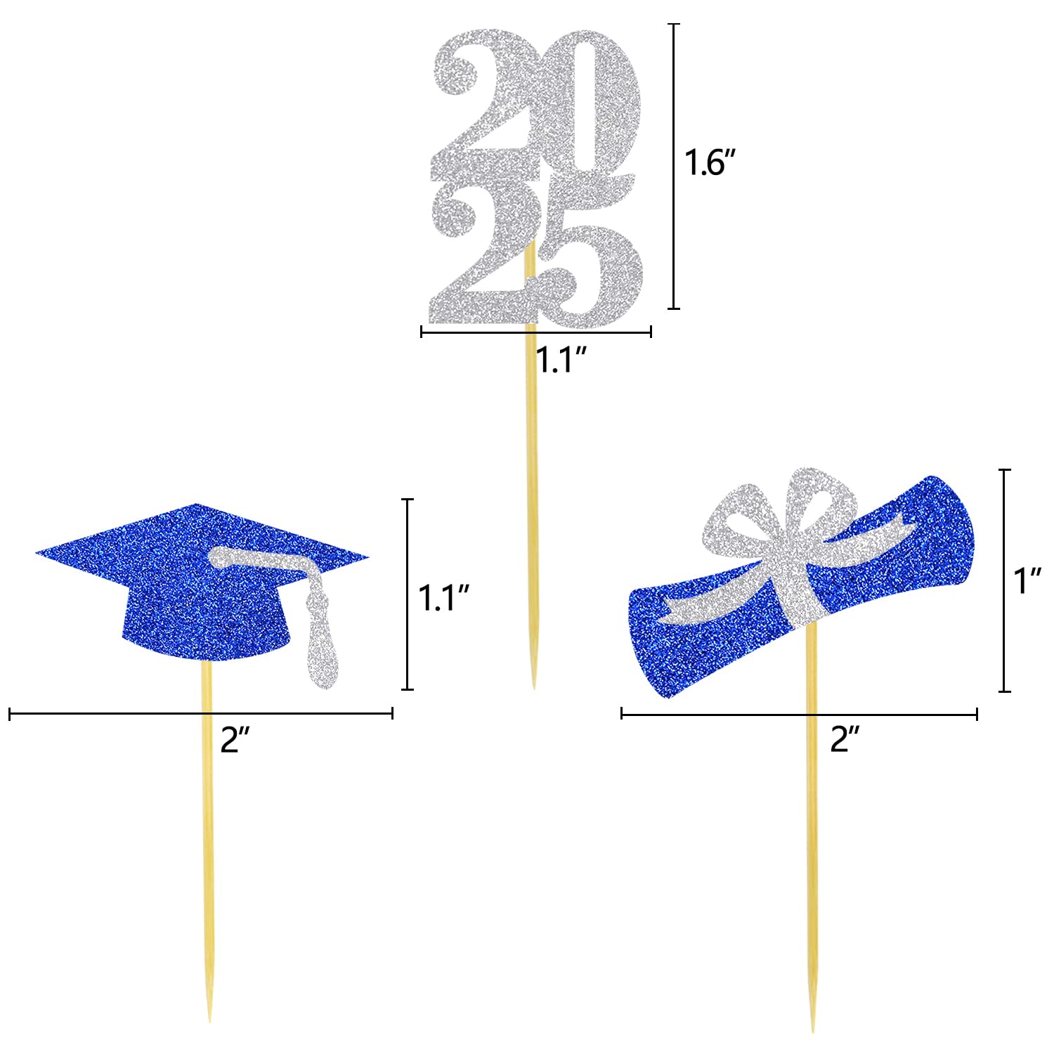 The small 2025 grad number topper measures 1.1 inches wide and 1.6 inches tall, glitter grad hat measures 2 inches wide and 1.1 inches tall, glitter grad diploma measures 2 inches wide and 1 inches tall