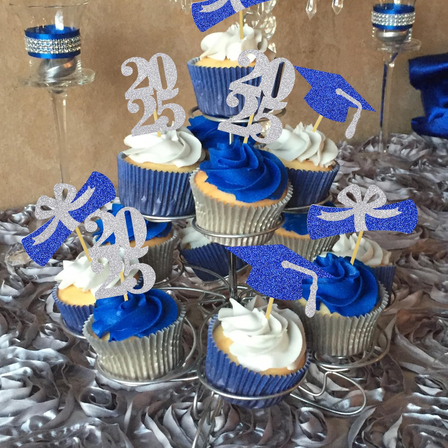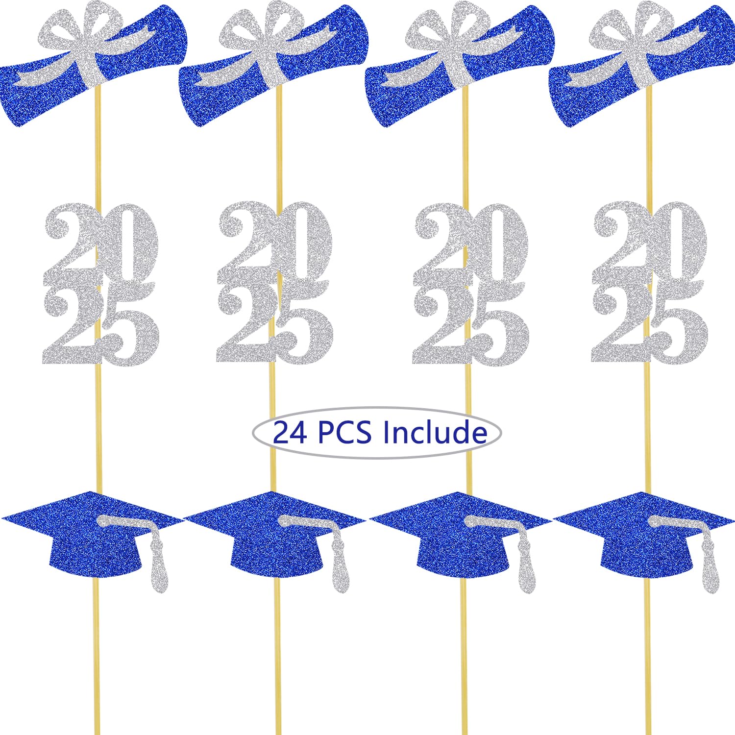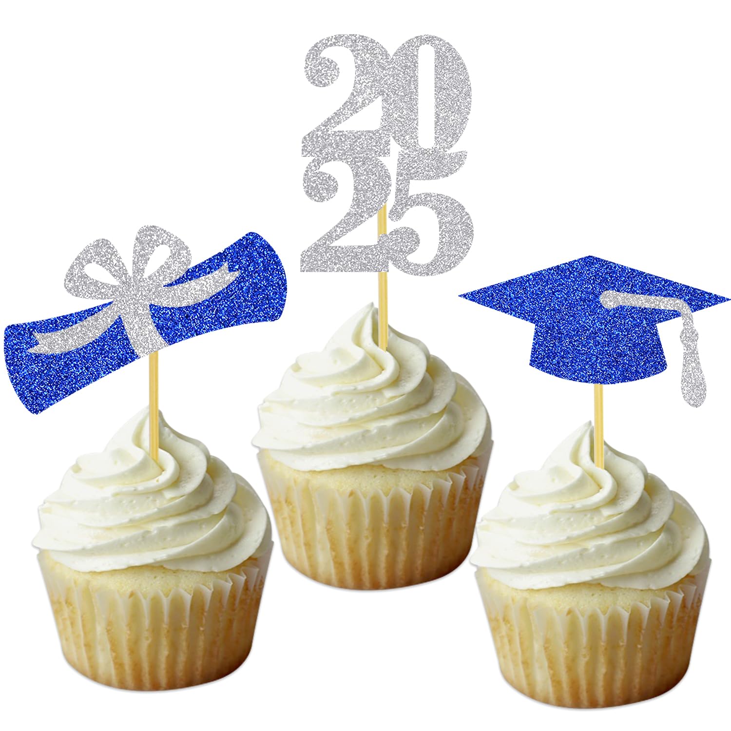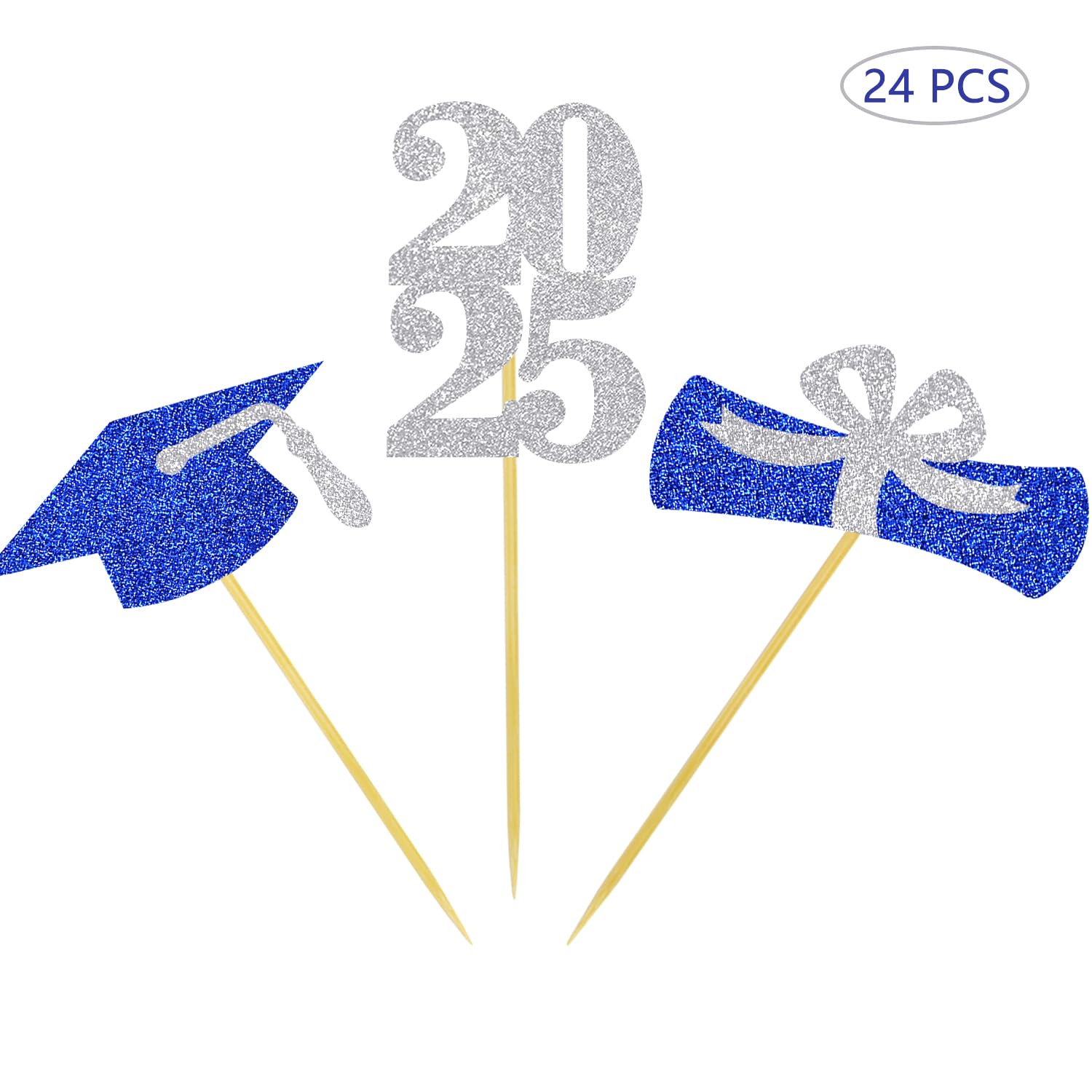 2025 graduation cap cupcake toppers: 8 pcs blue grad cap cupcake toppers with silver tassel, 8 pcs silver 2025 number cupcake toppers, 8 pcs silver and blue diploma bow cupcake toppers