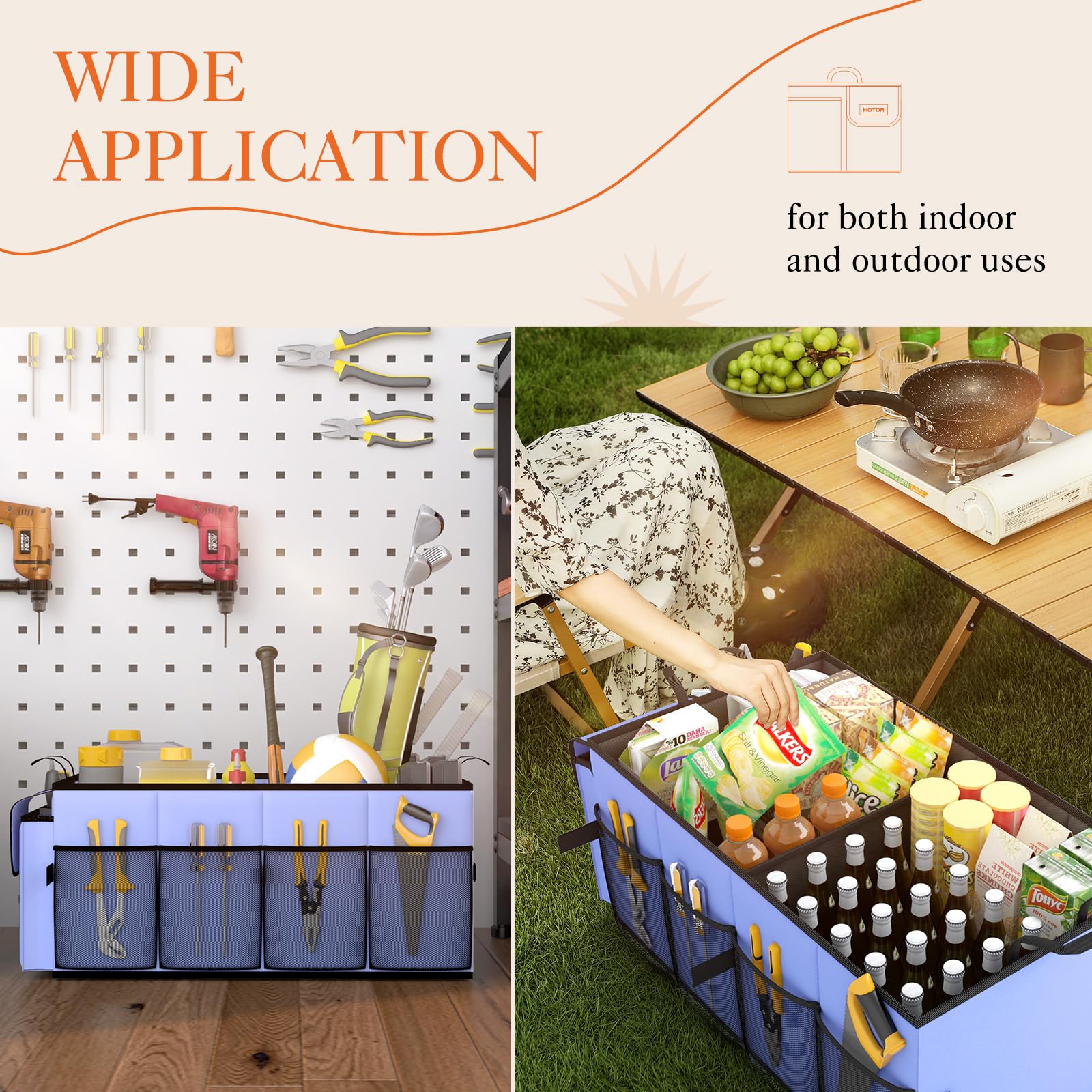 HARD-WEARING MATERIALS: Made of sturdy Oxford cloth with reinforced stitching on high-wear areas, this car organizer for trunk is built to last through heavy use. The thickened base panel and handles enable this product to bear over 60lb capacity.