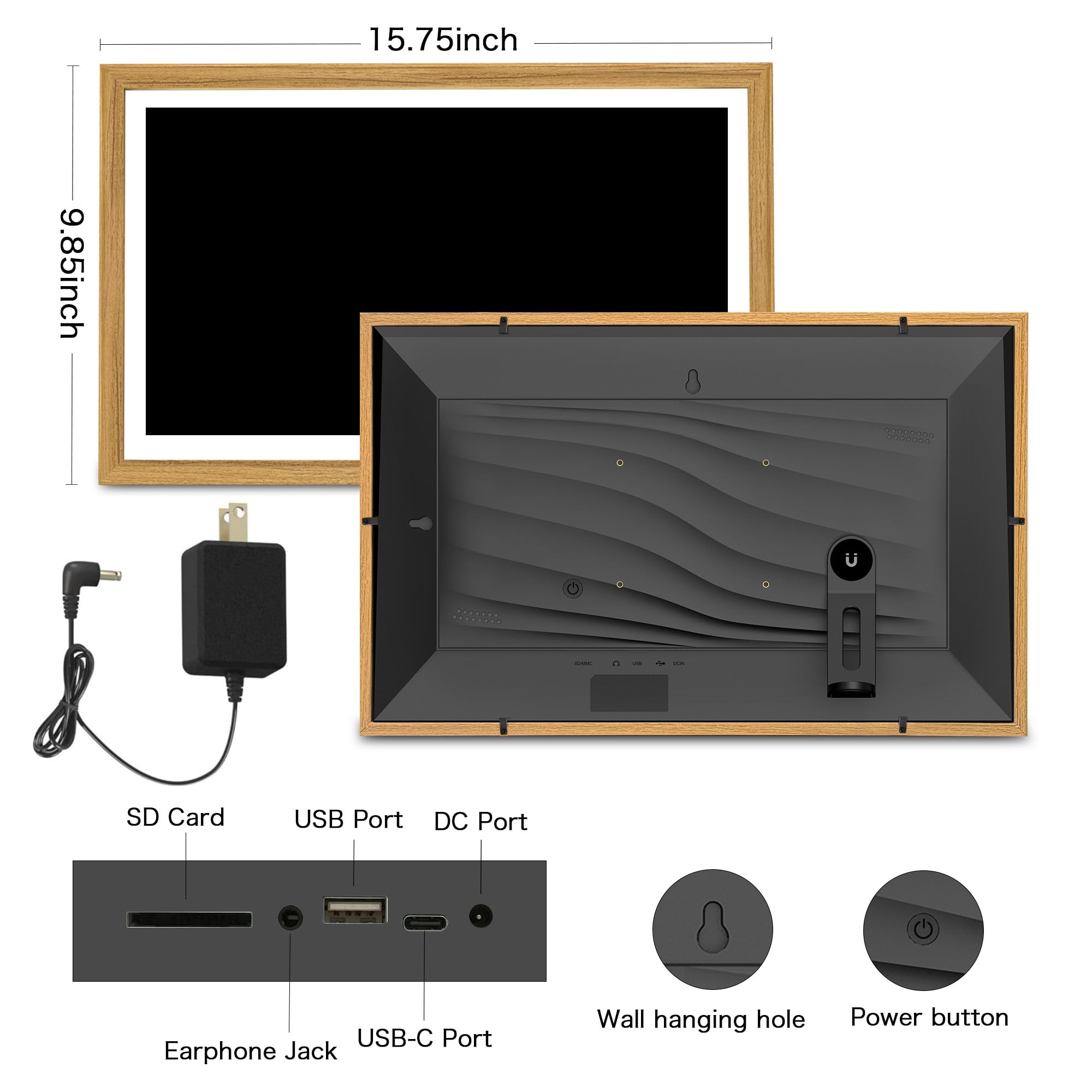 Support Non-WiFi Transmission; If WiFi and apps seem overwhelming for you or your family, no need to worry! Our digital picture frame 15 inch supports non-WiFi transmission. You can easily upload photos via Full Sized SD Card /USB Drive (Only support FAT32 format), or through computer (USB-C cable needed). This user-friendly feature is perfect for seniors, eliminating the need for apps or WiFi. Also, the Full Sized SD card or USB drive can be used directly as external storage for the frameo electric frame