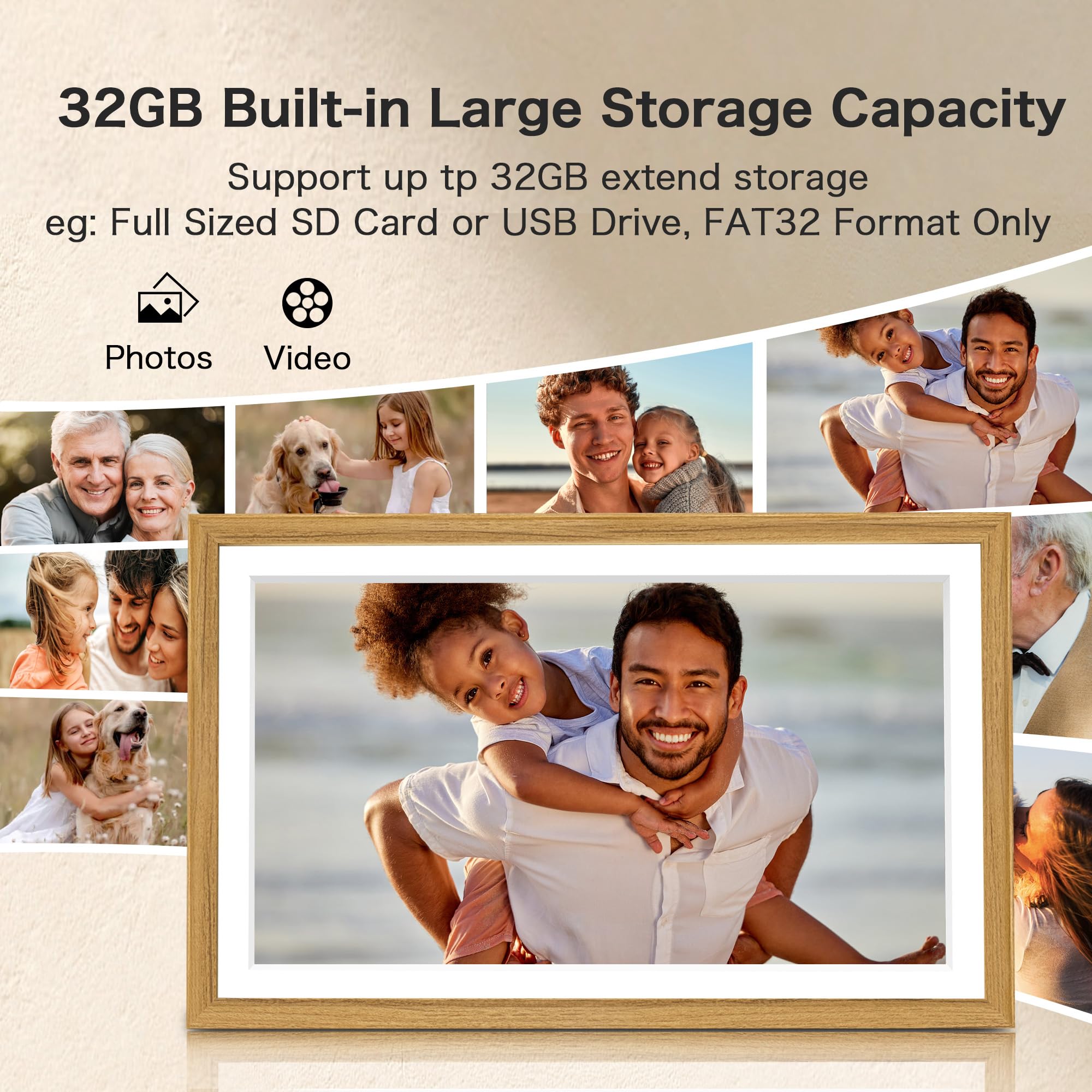 Instant Share via Frameo APP; Connect your digital picture frame to WIFI, and share photos and videos(Max.15s) quickly via a reliable App- Frameo to our digital photo frame from anywhere, privately and safely, no member numbers limited. Compatible with Frameo APP, no extra app needed. Our electronic picture frame slideshow has 32GB built-in memory and support up to 32GB external storage, enables you to share 50,000+ photos. Also, you can transfer via external storage or through a computer, no Wi-Fi needed