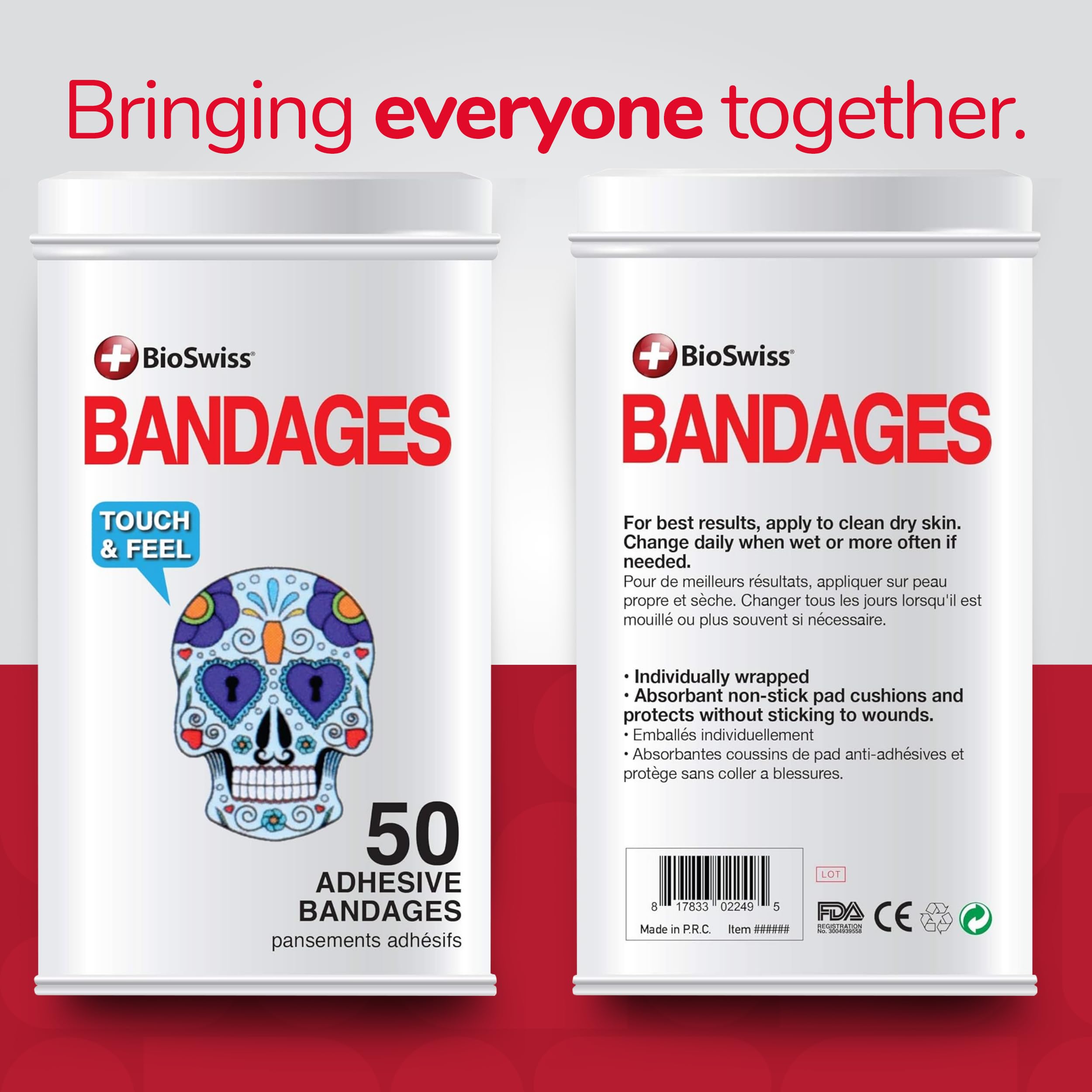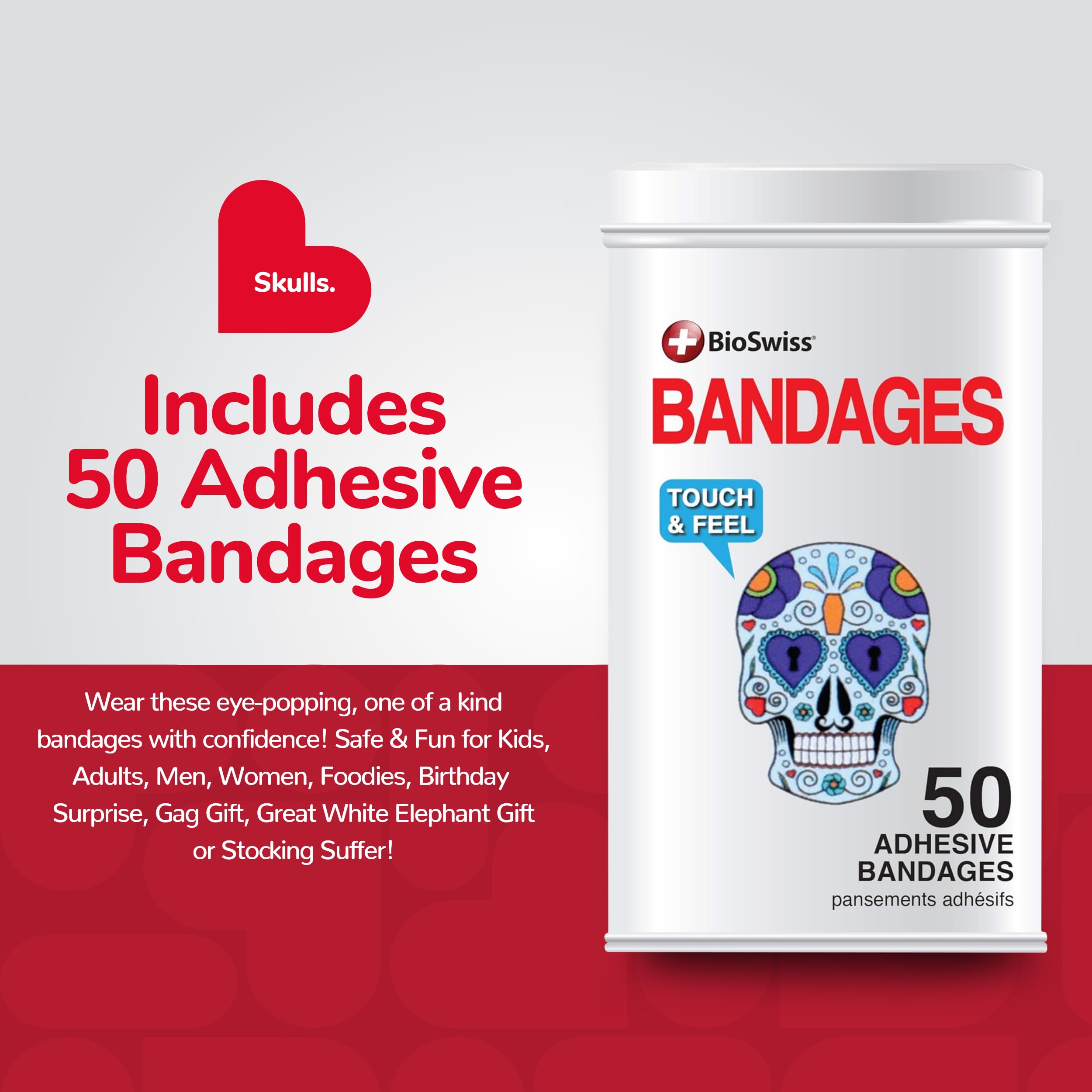 50 SKULL KIDS BANDAGES: Fun skull-shaped adhesive bandages tin helps protect cuts, scrapes, and minor wounds while making healing less stressful for children
