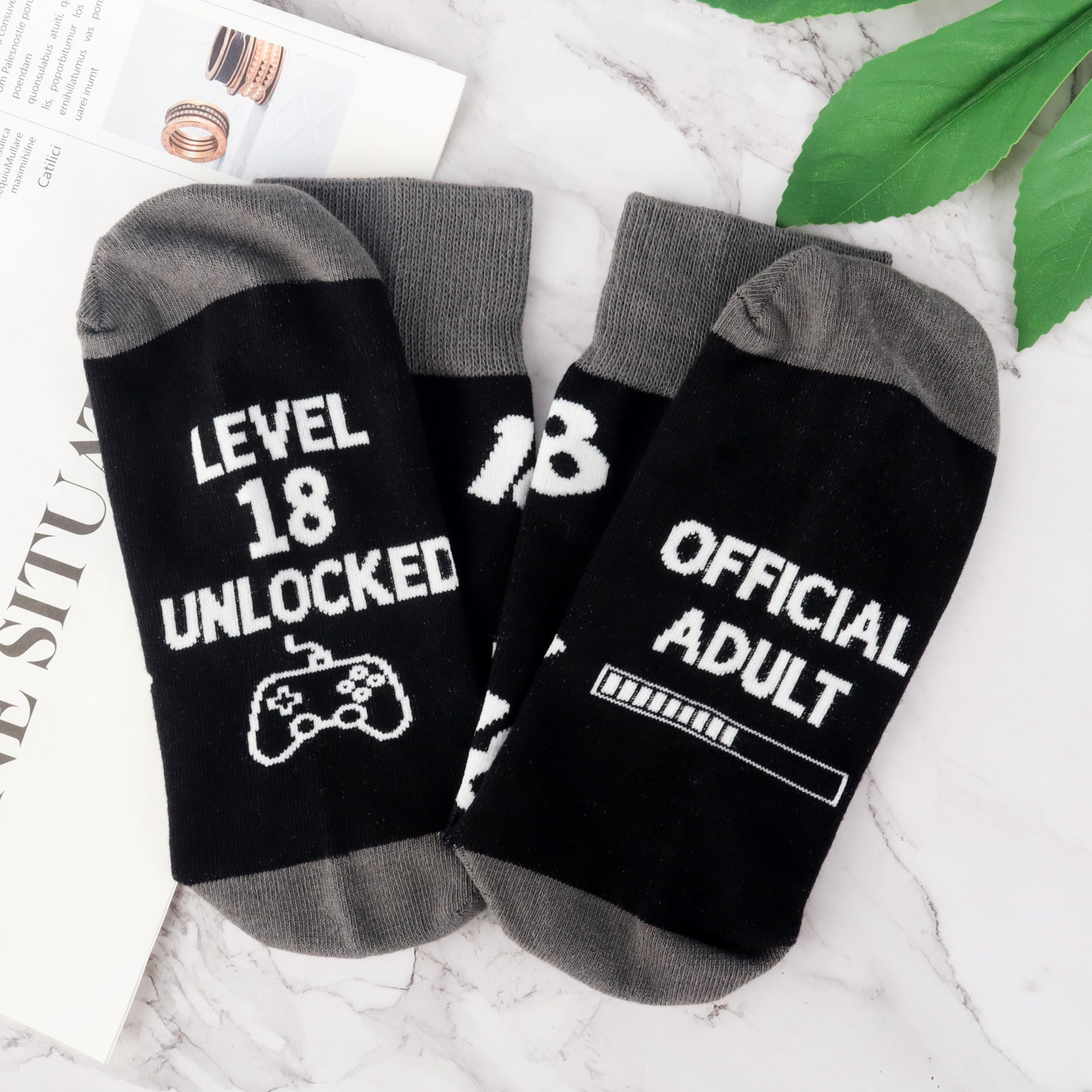 Crew Socks for Men: The 18 year old socks designed with funny words “OFFICIAL ADULT, LEVEL 18 UNLOCKED,” The cotton socks must be very good gifts for teen boys age 18.