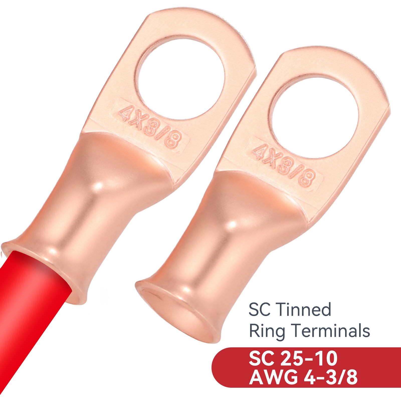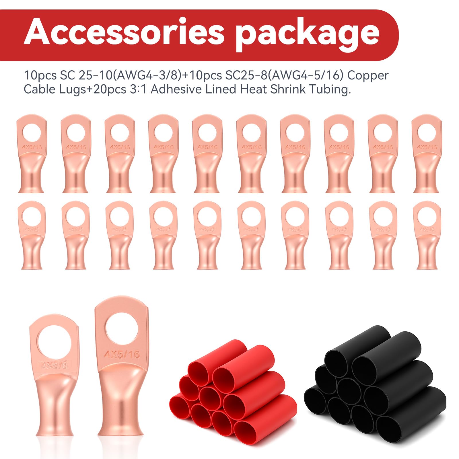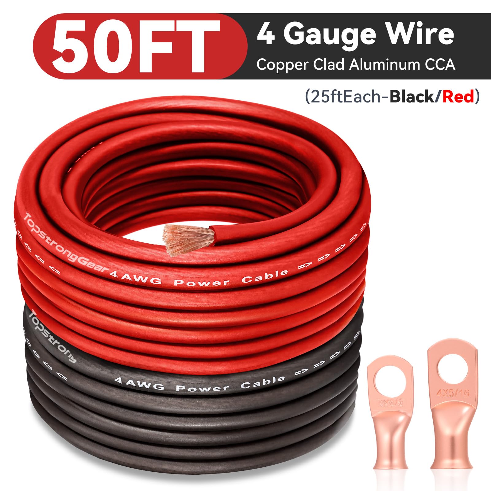 TOPSTRONGGEAR 4 GAUGE CCA GROUND WIRE KIT- Includes 25FT (7.62m) of each color Black & Red, 10pcs SC25-10(AWG4-3/8), 10pcs SC25-8(AWG4-5/16) Copper Cable Lugs, 20pcs 3:1 Adhesive Lined Hest Shrink Tubing, which offering true-to-gauge quality that guarantees the necessary power flow for your wiring projects. Thicker wire presents less resistance to current flow.