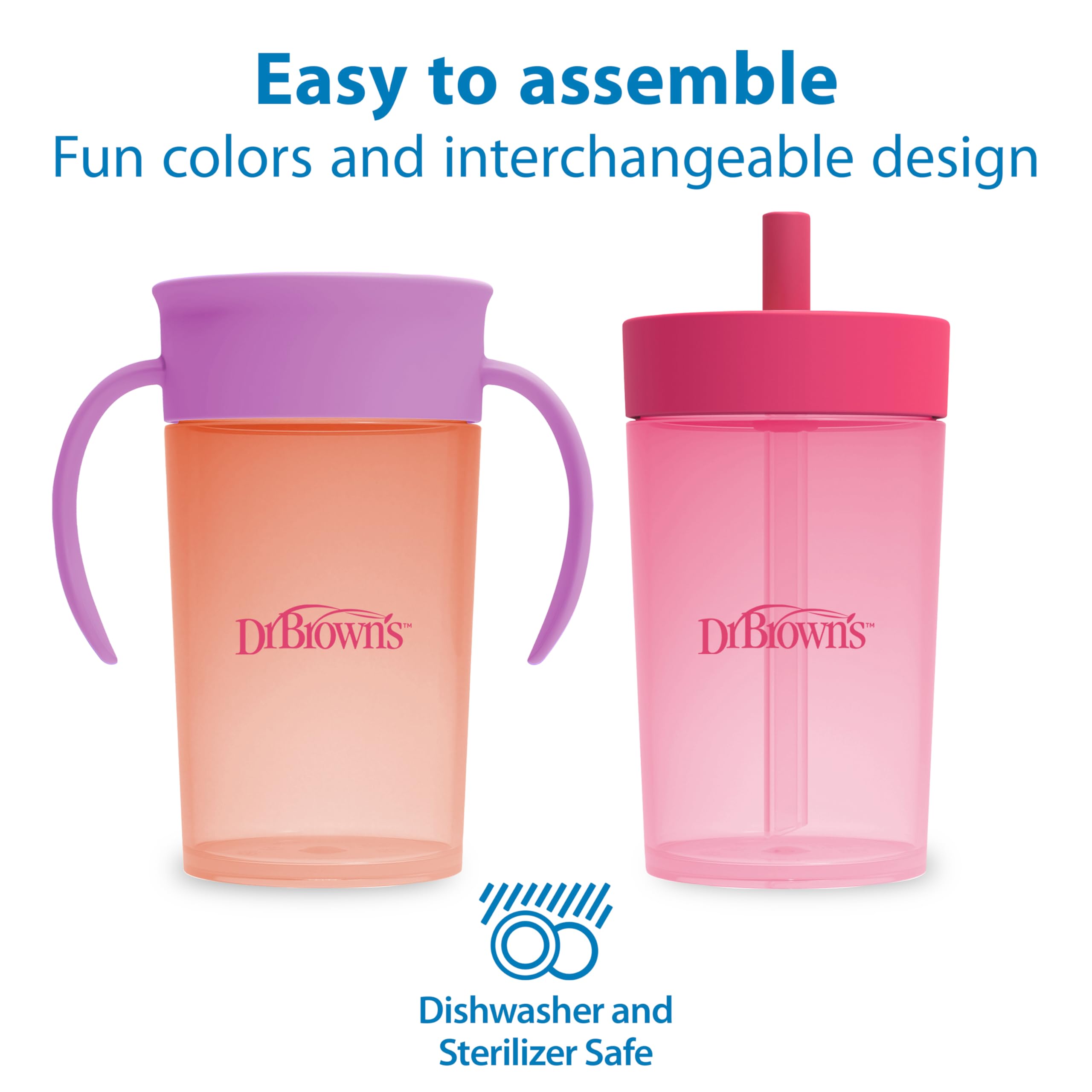 The all-in-one set to help baby transition to straw and big kid sipping. Dr. Brown's Straw to 360° Cup Set includes a lid with super soft silicone straw to help baby develop new straw-sipping skills. The silicone is gentle on baby's sensitive mouth and is spill-proof! Then when baby is ready, switch to the Cheers 360 sippy cup lid. The 360-degree design lets baby drink from any edge, and the Sip and See clear silicone valve lets baby see inside without spilling for true leak-free learning. The Cheers 360 lid features handles that are easy for little hands to grasp and tilt while developing independent drinking skills. The cup is translucent so you can see when it's time for a refill, and the easy to assemble three-piece design is dishwasher (top rack) and sterilizer safe for easy cleaning.