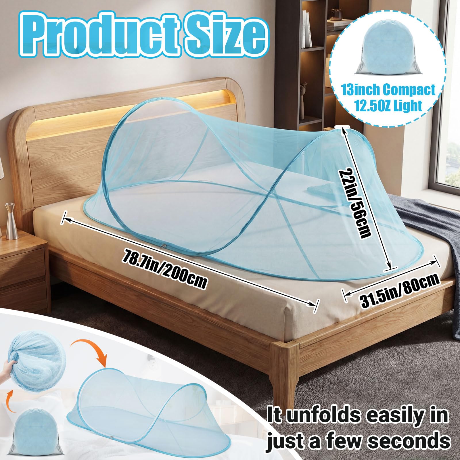 Features: This mosquito net is light in weight, making it effortless to carry around, whether you go planning a camping trip, it easily fits into any suitcase. These pop up mosquito nets have an understated black color, seamlessly blending into your decor. Specifications: Material: polyester fiber Color: blue Size: about 78.7 x 31.5 x 22 inches/200 x 80 x 56 cm Package includes: 1 x Mosquito net Notes: Manual measurement, please allow slight errors on size. The color may exist a slight difference due to different screen displays