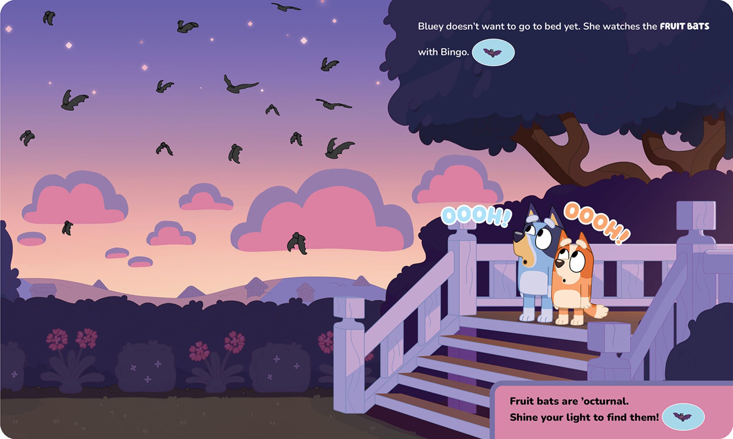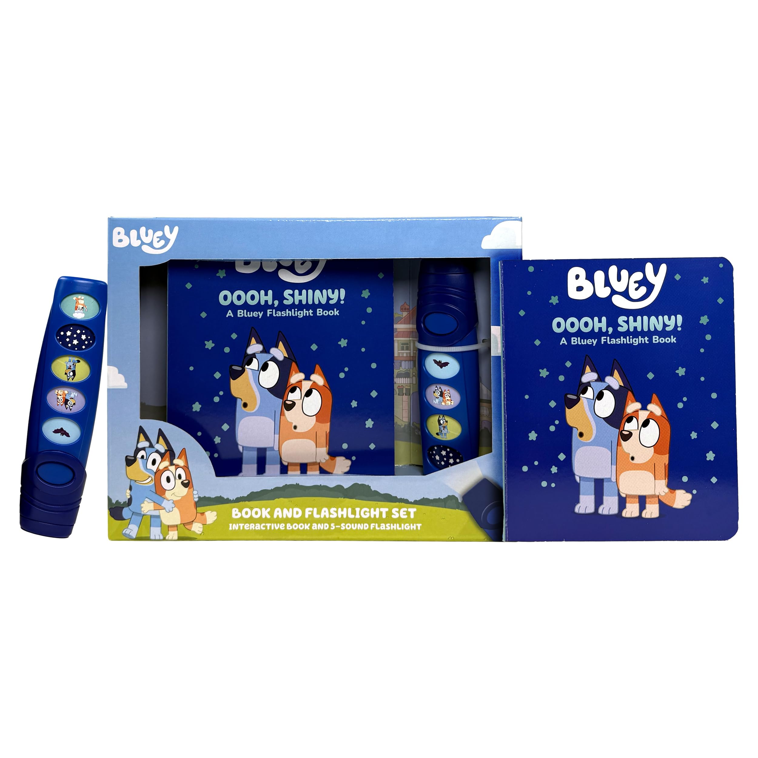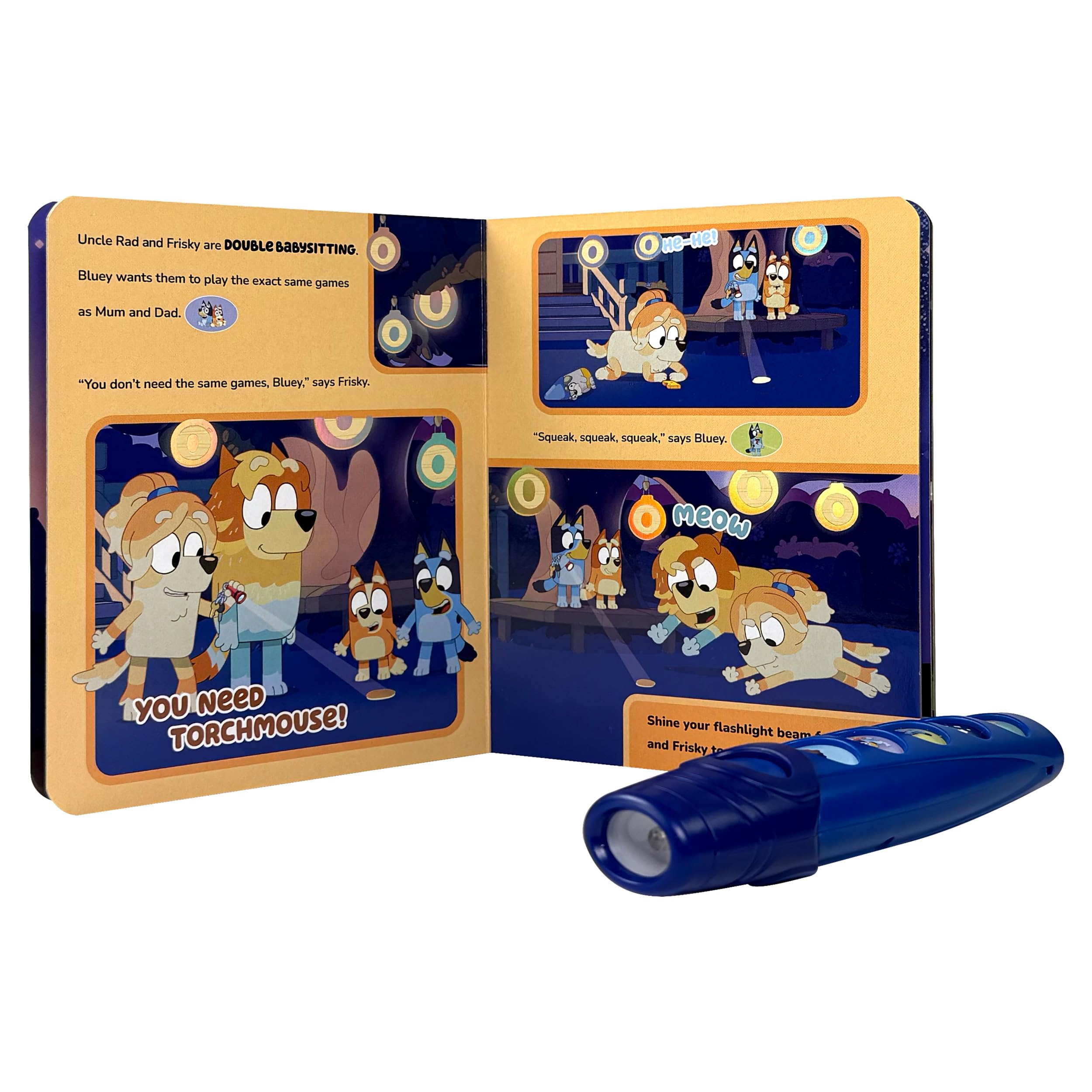 Hooray, stay up late! Grab your flashlight and get ready for loads of shiny fun. The foiled pages shine in your flashlight's glow, and 5 buttons on the flashlight play sounds to enhance the experience! The sound storybook encourages imagination, exploration, and play. Includes a real working flashlight.