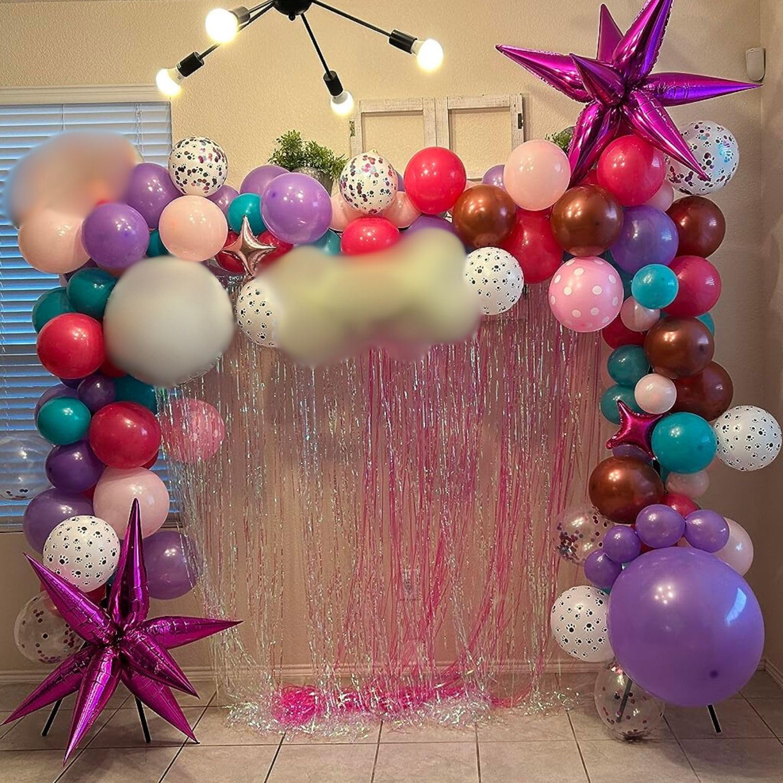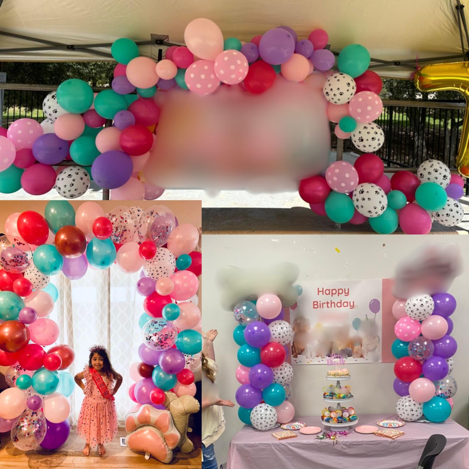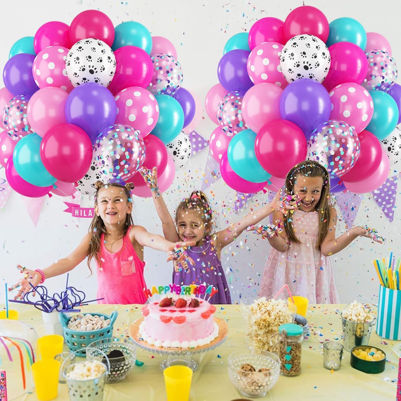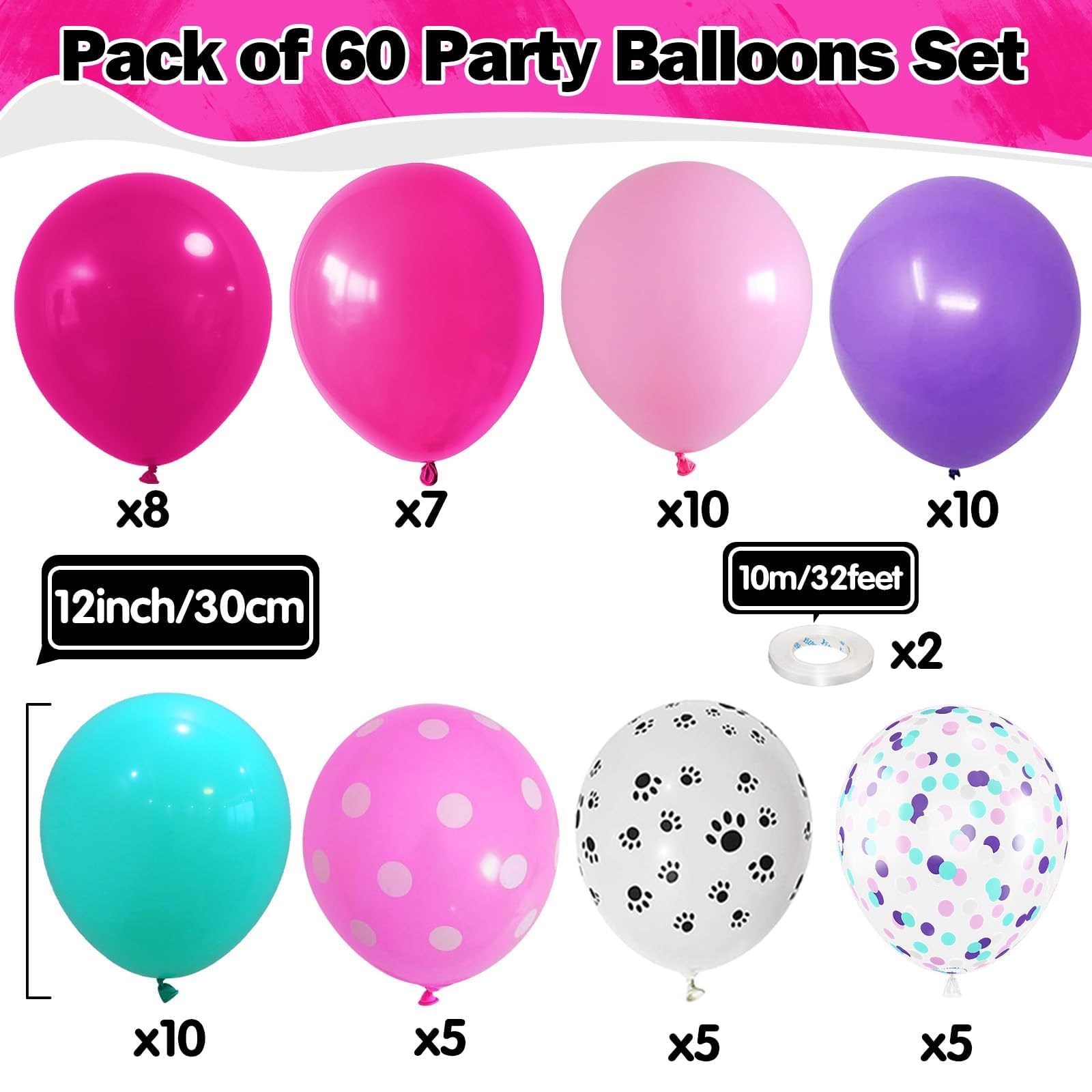 🎈Package Includes - You'll get 60 pieces 12 inch party balloons (8pcs magenta balloons, 7pcs rose red balloons, 10pcs pink balloons, 10pcs purple balloons, 10pcs teal blue balloons, 5pcs pink polka balloons, 5pcs dog paw balloons, 5pcs teal purple confetti balloons) and 2 rolls of 10m ribbons, which are enough to decorate your party, these dazzling colors will make your party attractive, a great way to decorate any theme party. You can make balloon bouquet, balloon arch backdrop decoration.