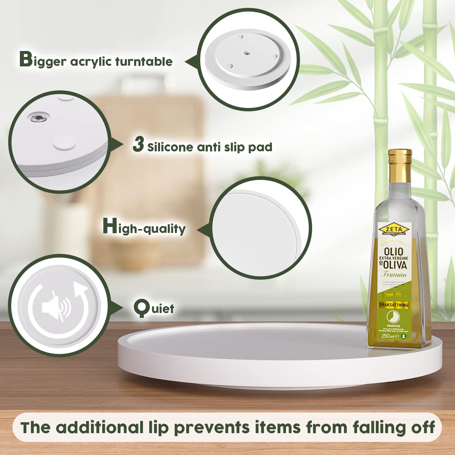 Updated Design: Bigger acrylic turntable with 3 silica gel skid prevention pad makes lazy susan organizer rotate smoother and quieter. You can get any item from any angle. The additional lip prevents items from falling off