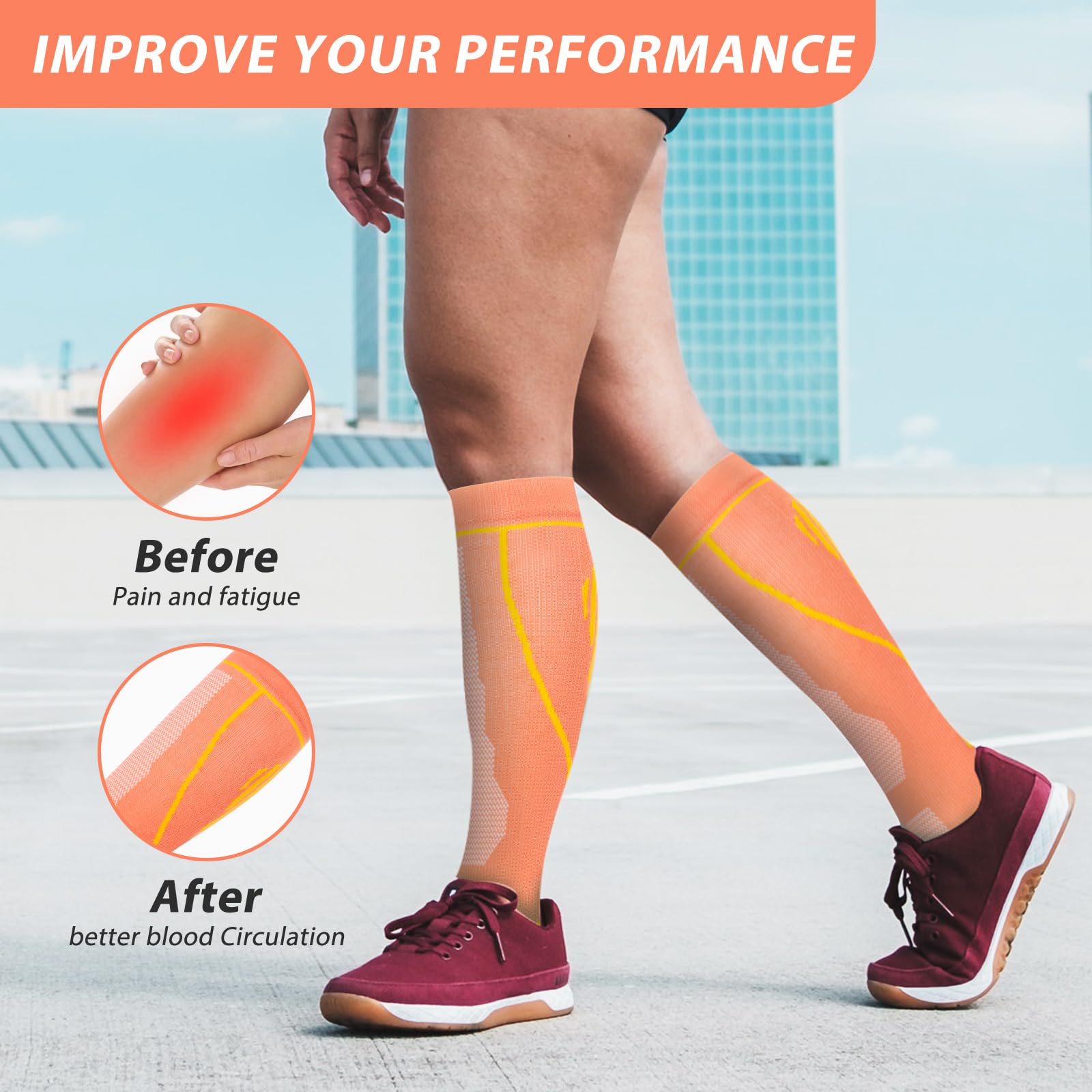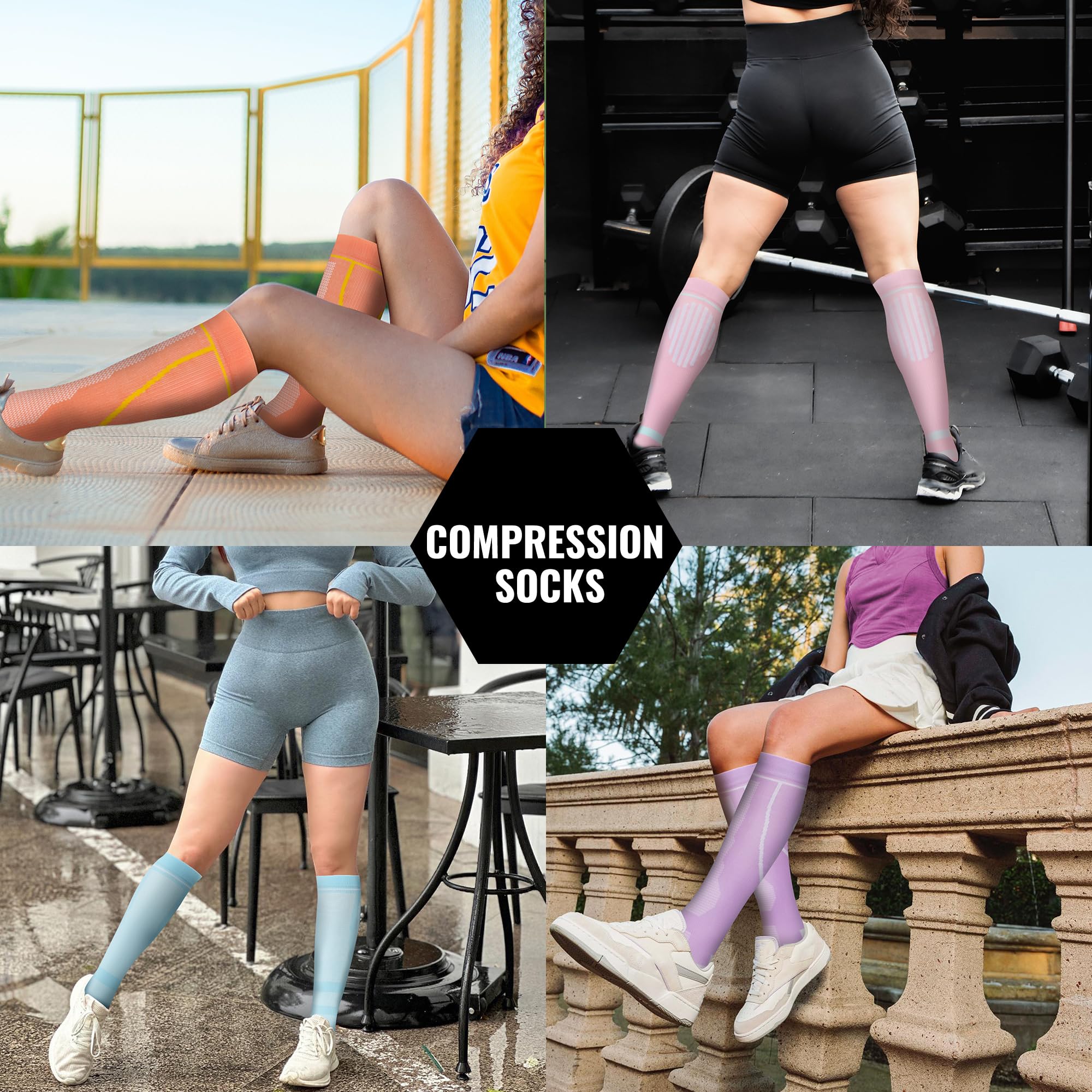 VERSATILE STYLE FOR ALL OCCASIONS: Our compression socks for men and women fit various lifestyles. Whether you're running, traveling, nursing, flying, pregnant, or need muscle support, these long compression socks men have you covered with high-quality performance. Suitable for all sports, cycling, skiing, mountain climbing, football, hiking, jogging, tennis, marathon, hockey, soccer, basketball, golf, etc. From daily wear to special occasions, experience lasting comfort.