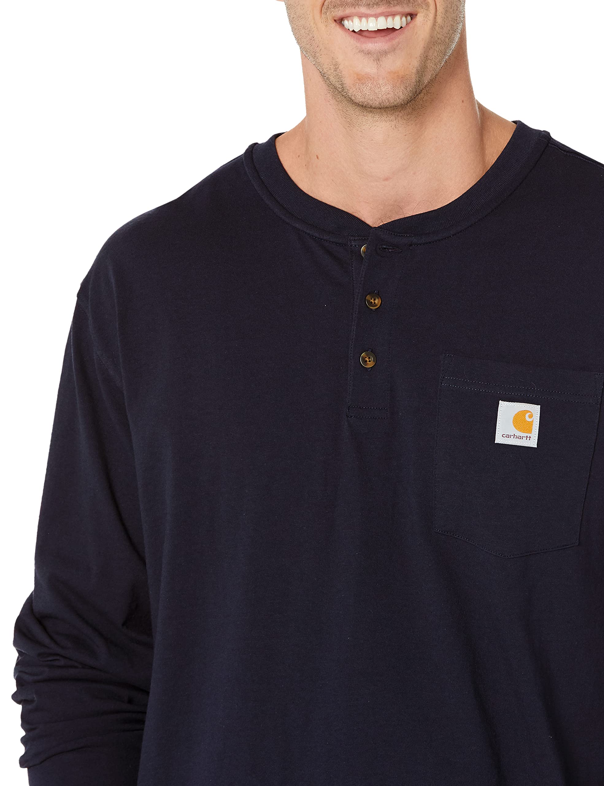 Description Carhartt's long sleeve work wear henley is an all-purpose work shirt that is perfect for cooler days or as a layering piece Made of 675-ounce, 100-percent cotton jersey, it features a rib-knit collar with a three-button closure and a left chest pocket It also has side-seamed construction to minimize twisting and maximize comfort ash fiber content is 99-percent , 1-percent polyester Heather gray fiber content is 90-percent cotton , 10-percent polyester