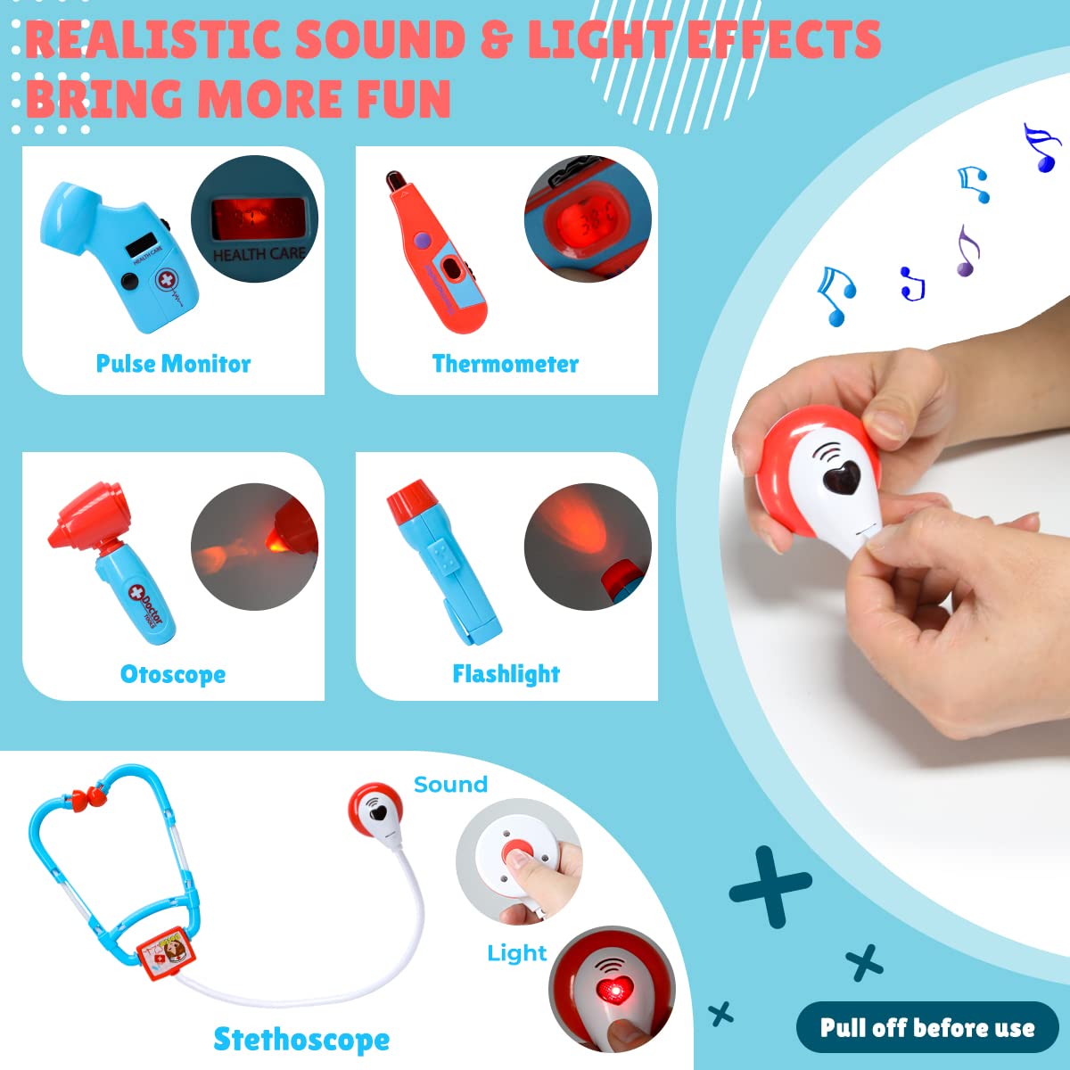 A Chance to Experience Doctor Dentist, Ease the Fear of Doctor Visit. This doctor toy set features enough medical tools for your girls pretend to play the role of doctor, dentist or patient, learn more about the healthy knowledge and ease anxieties about check-ups. It is good for familiarizing your little girls with any medical tools and “seeing a doctor”procedures to calm doctor-related fears.