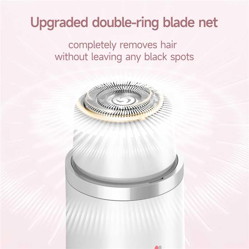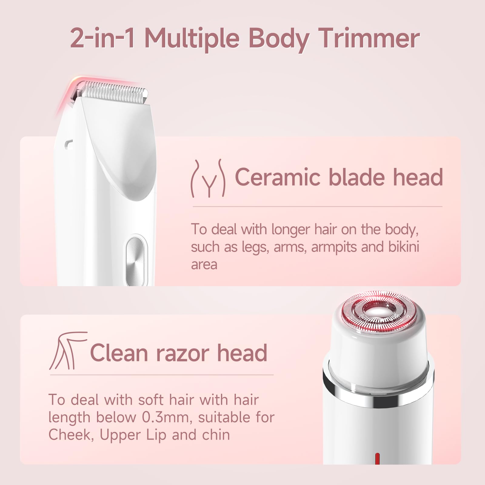 💞【2-in-1 Bikini Trimmer】This bikini trimmer for women features two efficient shaving heads capable of removing hairs on various parts of the body. barber-grade ceramic blades head is a body shaver, perfect for arms, legs, armpit, bikini areas, or other body parts, the other shaver head is made of hypoallergenic stainless steel and is suitable for fine and short hair on the face and other areas, mainly for removing hair on the cheeks, chin and upper lips