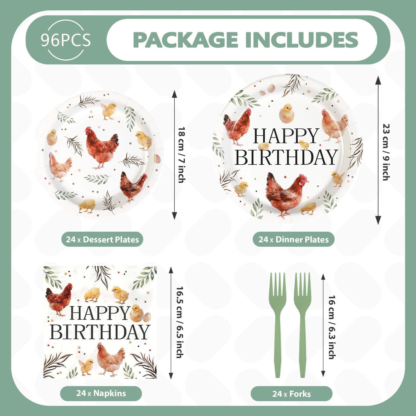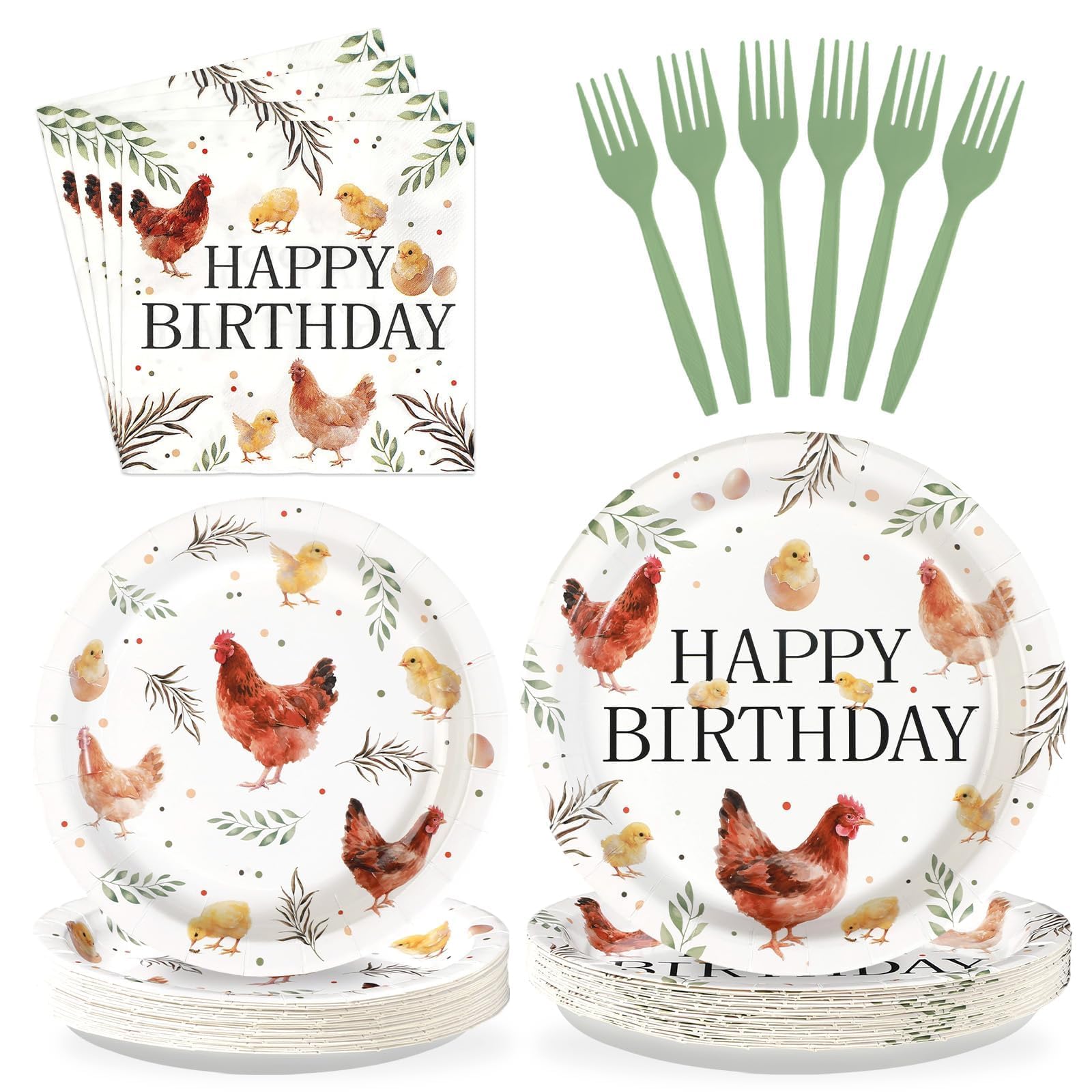 Adorable Chicken Birthday Theme Design: Step into the charming realm of our chicken themed party supplies! Dinner plates feature vivid scenes of hens and chicks paired with "Happy Birthday" lettering. Dessert plates echo the theme with cute chicken illustrations and colorful graphics. Napkins have "Happy Birthday" in a whimsical font, along with little chick motifs on white backgrounds. The green forks complete the look, blending functionality with the chicken themed style