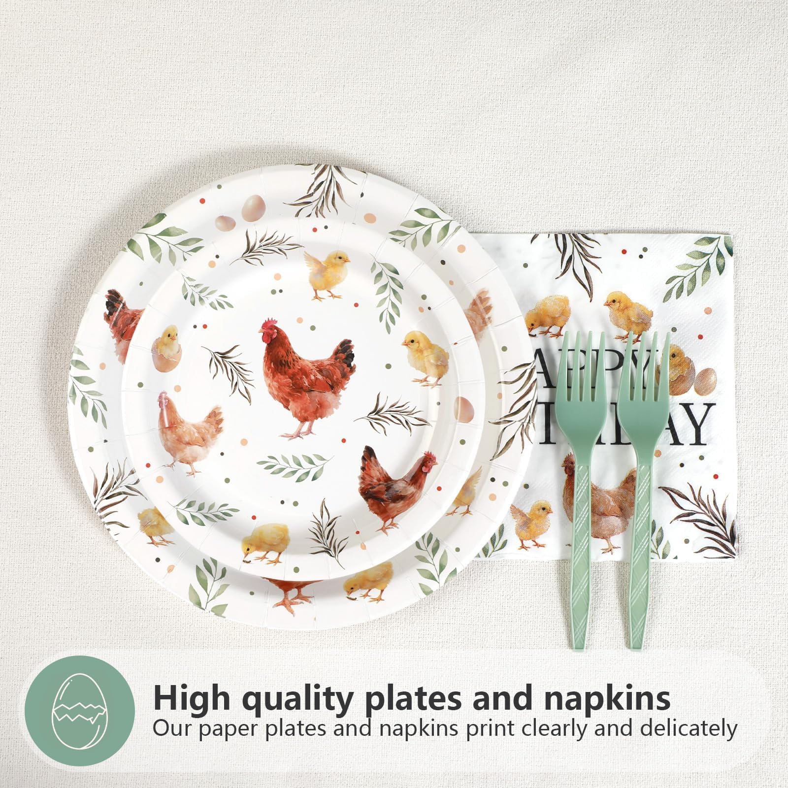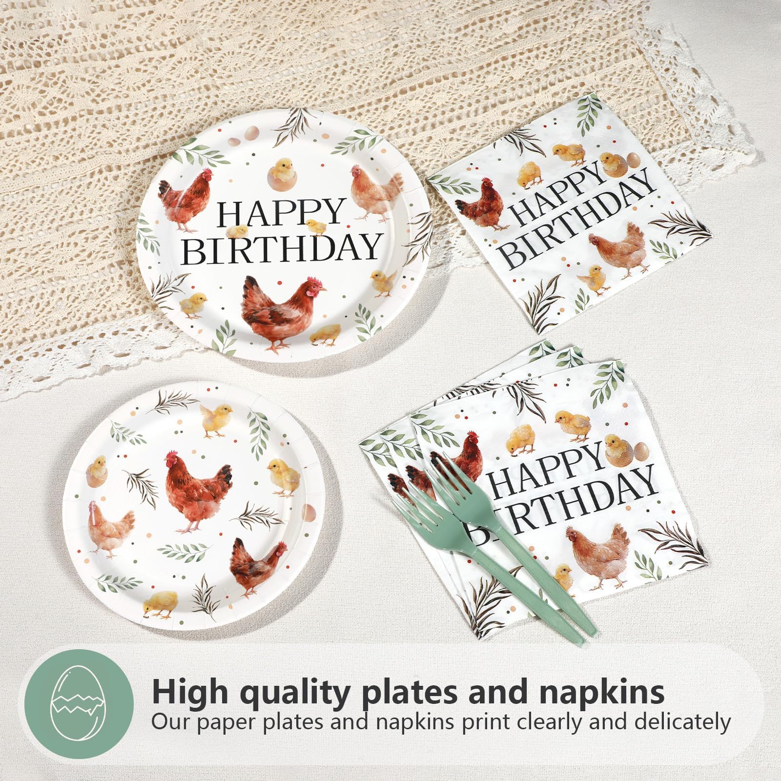 Quality Material: Our chicken birthday party supplies are made of high quality thick paper,happy birthday plates are solid and durable, cut-resistant, no need to worry about bending or leaking; birthday napkins are soft, thick and absorbent. The fork is made of high quality plastic, not easy to break. The pattern is beautifully and clearly printed and will not fade. High-quality materials can withstand the rigors of lively celebrations (Tip: please do not microwave the dinner plate)