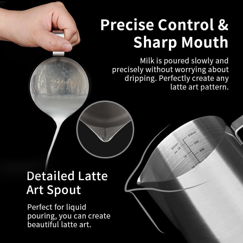 Dripless Spout Design: The dripless spout design ensures smooth and precise pouring without drips. Practice and easily create your own beautiful latte art.