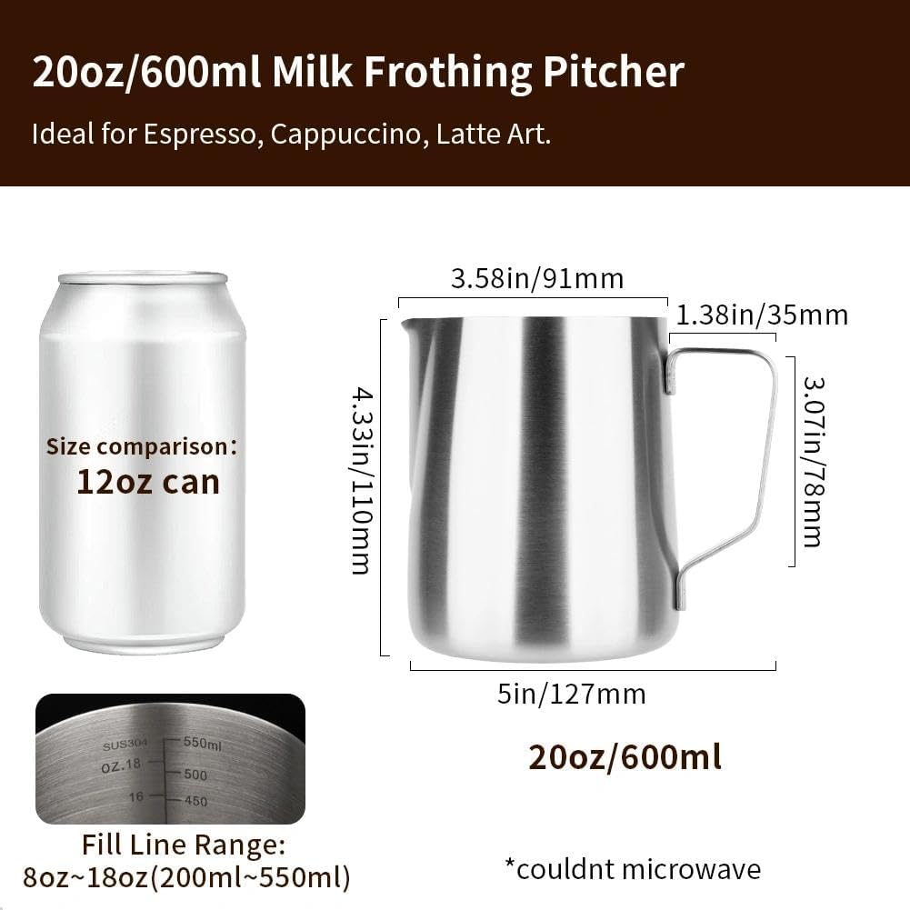 Clear Scale Lines: The clear internal measurement lines (ml/oz) make it easy to control the amount of milk or cream per cup of coffee. Available in 12oz/20oz/32oz sizes to meet your different needs. Ideal for foaming or steaming milk for espresso and cappuccinos, and versatile for measuring other liquids like water, juices, batter mixes, smoothies, etc.