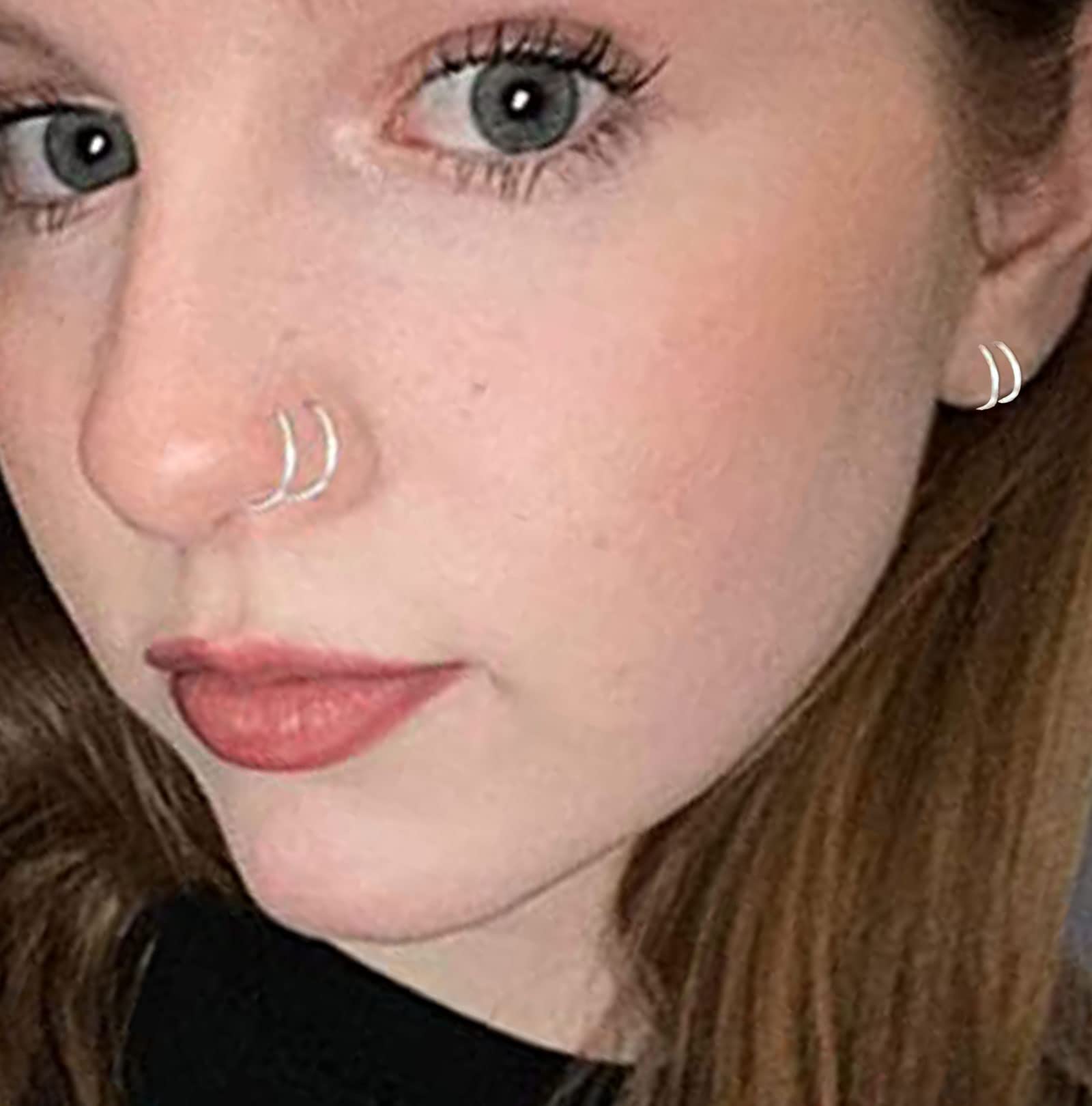 Size:pole diameter 18g=1.0mm=0.04inch. Inner diameter 8 mm=0.03inch. Your nose is suitable for double hoop nose ring 18 gauge or below. The larger the gauge value. Means The thinner the double nose piercing.