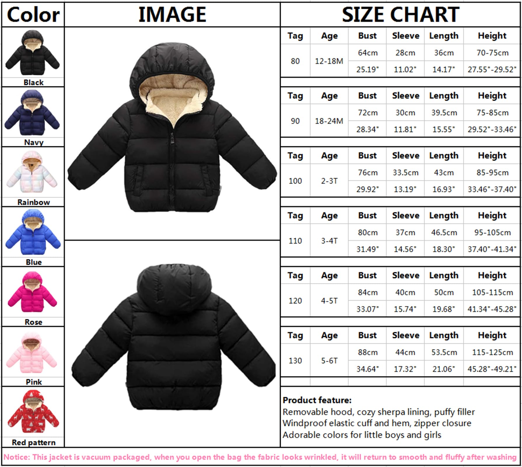 Material: polyester fabric, puffy filler, sherpa lining, warm winter hooded jacket, windproof fabric, cozy and soft coat for baby boy and girl