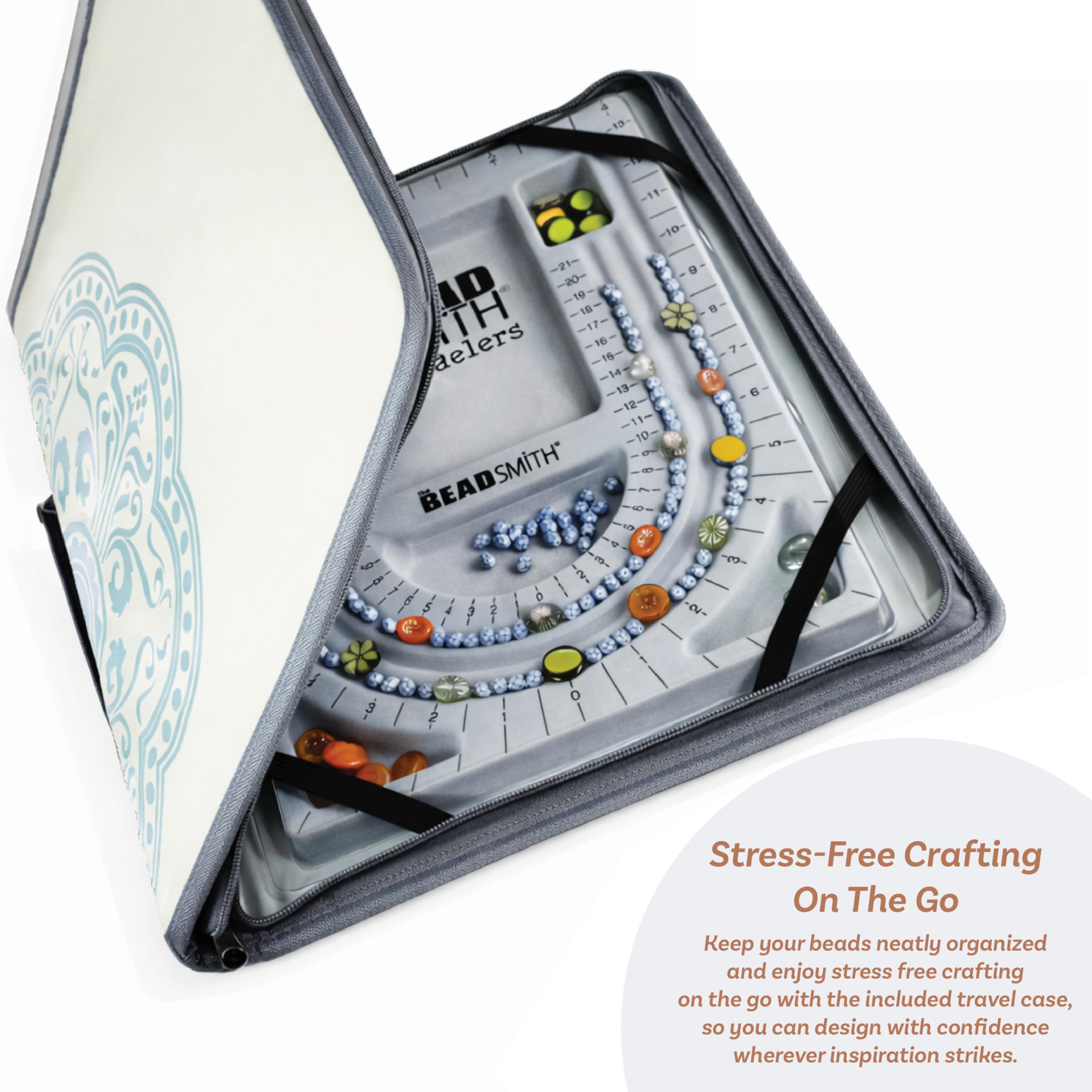 BEAD FOLIO: Our storage case is the perfect solution for beading on-the-go, working on a project while you travel or toting your partially made jewelry to your next bead class. The Bead Folio measures 11.5” x 14.5” x 1.25” and 24” across when fully open. The elastic straps and mesh pouch hold everything in place, while the zipper closure keeps everything inside. There’s also a carrying handle for easy transport.