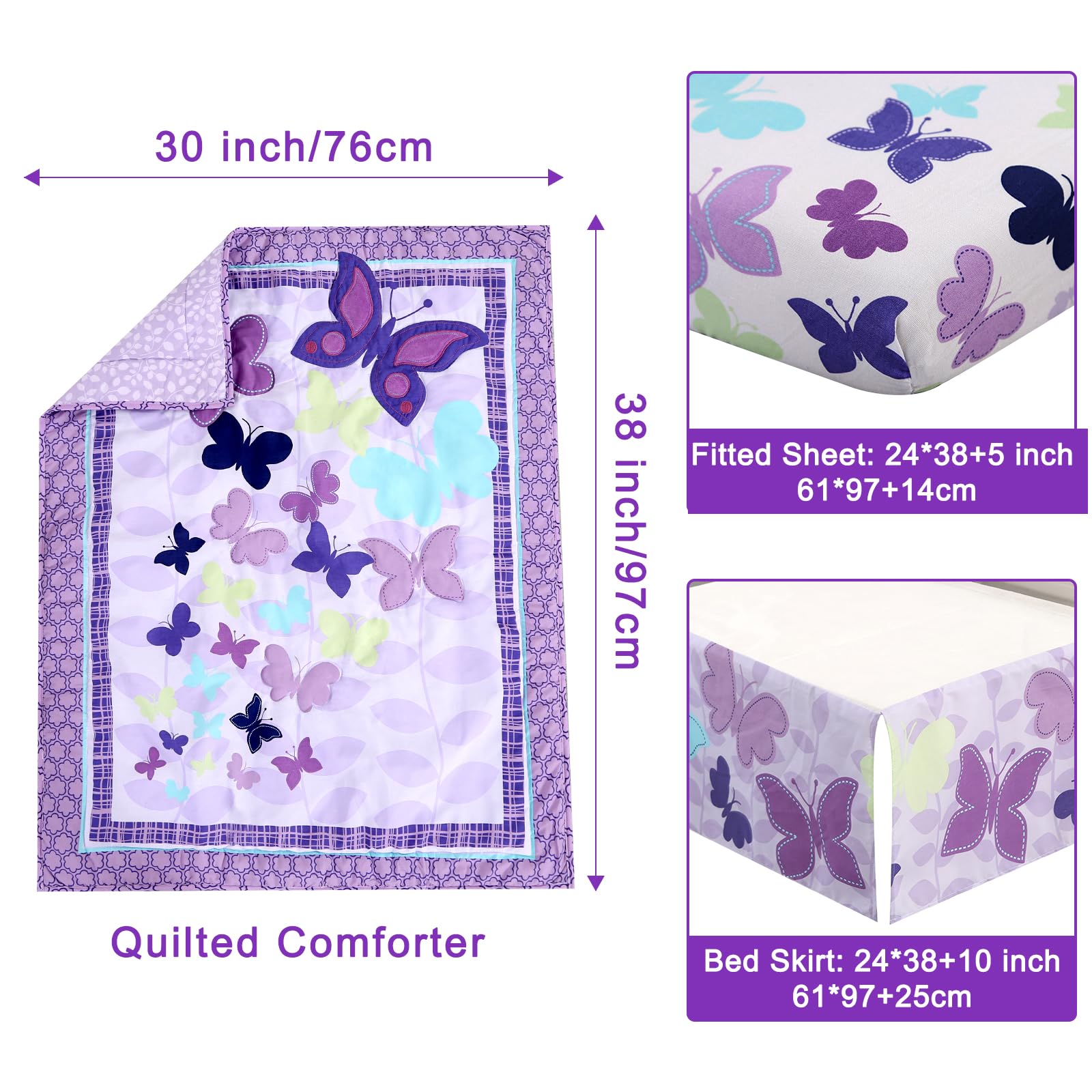 【Theme】The purple mini crib bedding features cute butterflies. It create a dreamy bedroom, bringing more color and warmth to life. You will find your baby getting a restful sleep