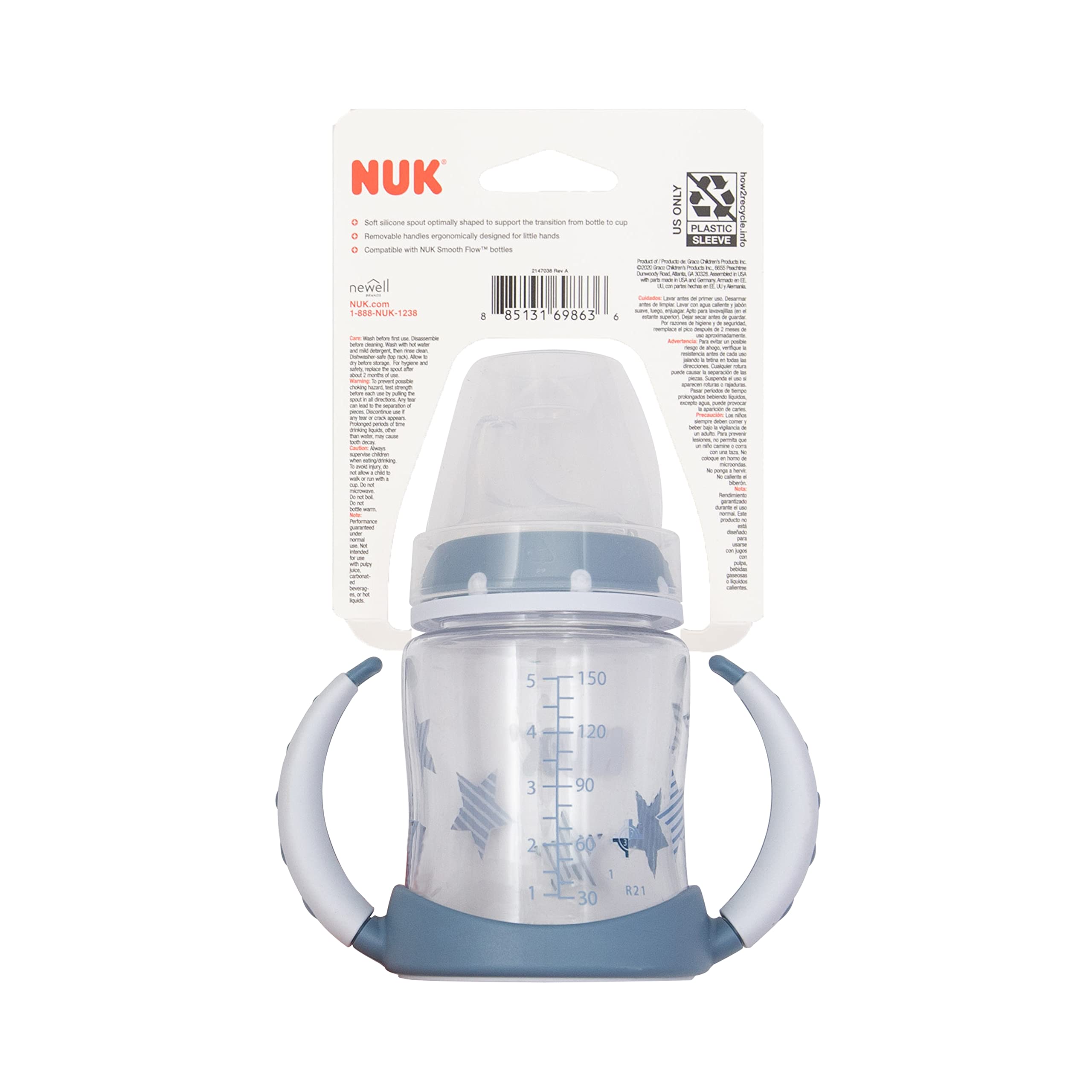 The NUK Learner Cup easily promotes baby’s transition from breast or bottle to sippy cup. This learner cup features a spill-proof, soft spout that is gentle on teeth and gums, and it includes an air vent that helps reduce swallowed air. The toddler cup also comes with easy-to-grip, removable handles that your growing child will love. NUK Learner Cups are made of crystal-clear Tritan® material, and are BPA-free and dishwasher-safe. Our 5-oz. learner cups are recommended for babies and toddlers 6 months and older.