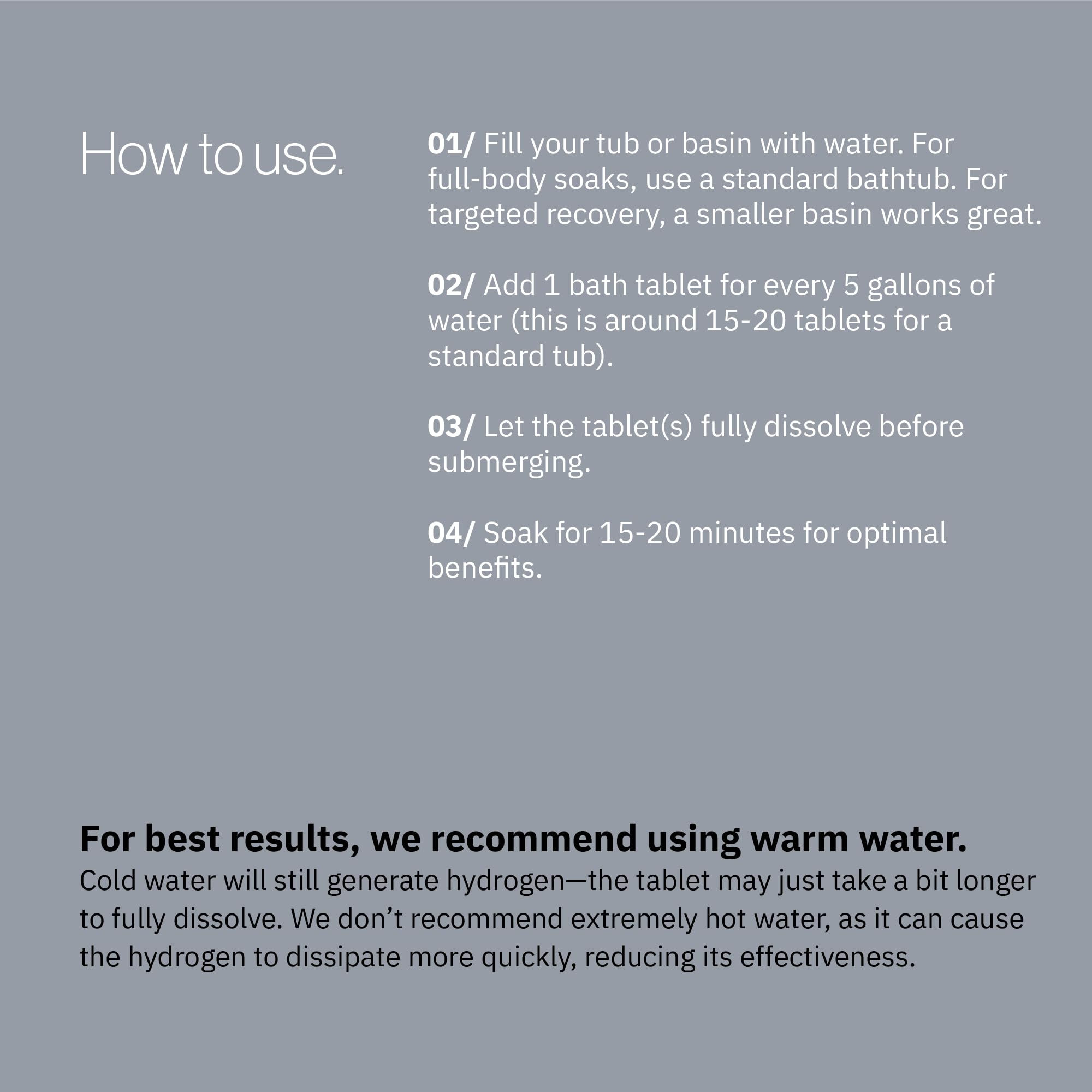 Add one tablet per 5 gallons of water— 15 to 20 tablets to a standard bath—and soak for 15–20 minutes. Great for full-body soaks or targeted relief for hands and feet. A clean, effortless ritual designed to help you feel your best—inside and out.