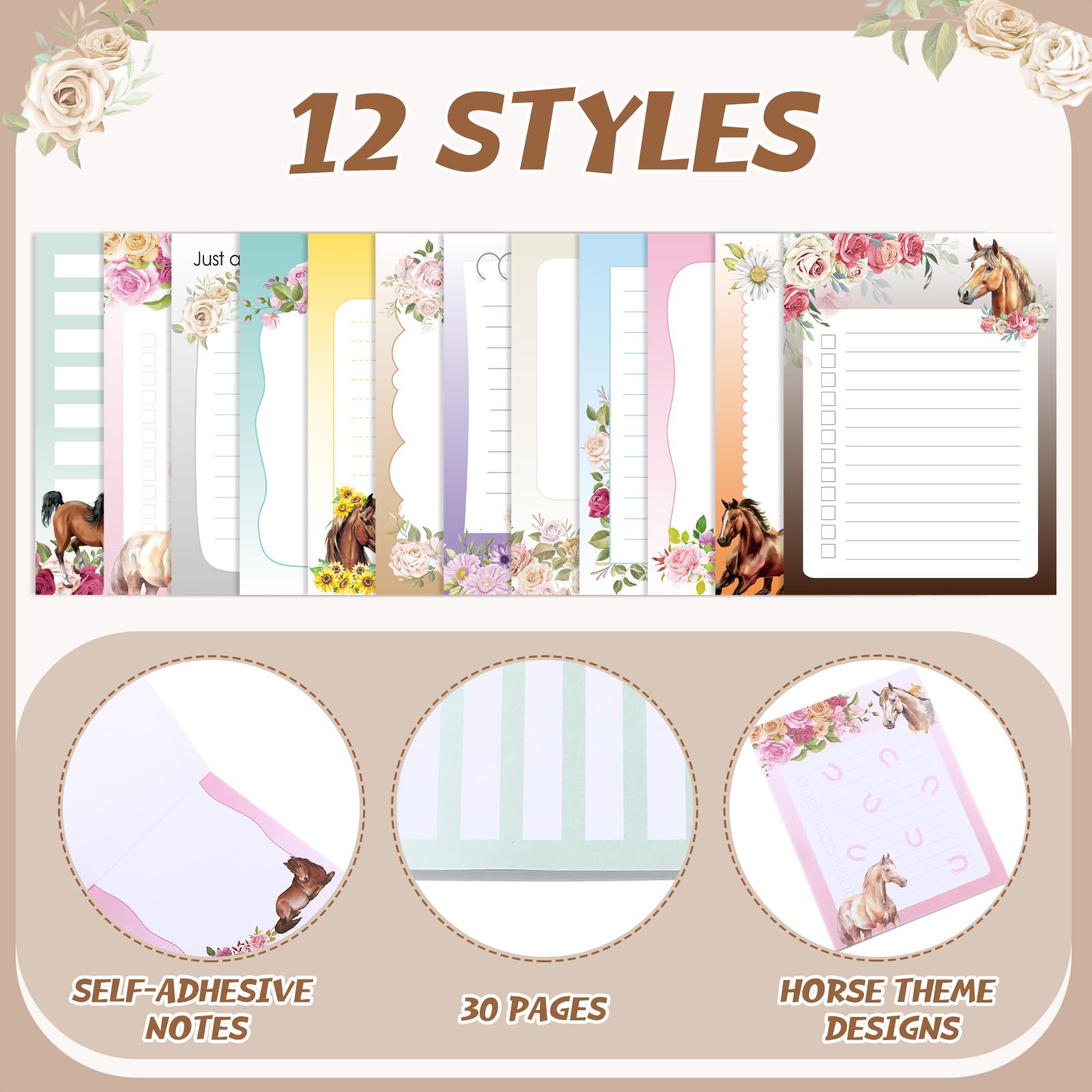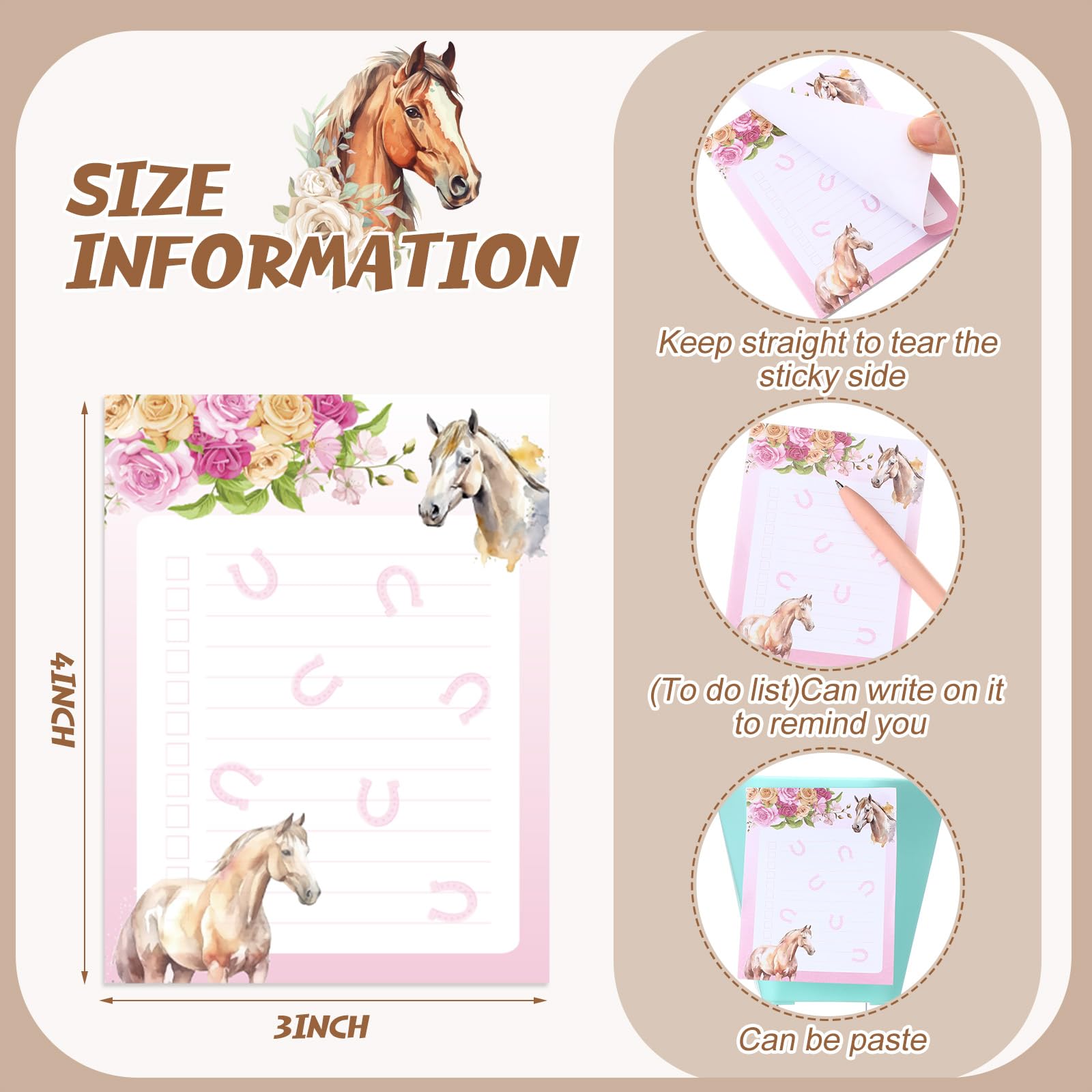 Sufficient Quantity: you will receive 12 pieces of horse themed sticky notes, packaged with 30 pages each, for a total of 360 sheets; The dimensions are a handy 3x4 inches /7.6x10 cm, enough quantity and rich design to meet your various needs and replacements