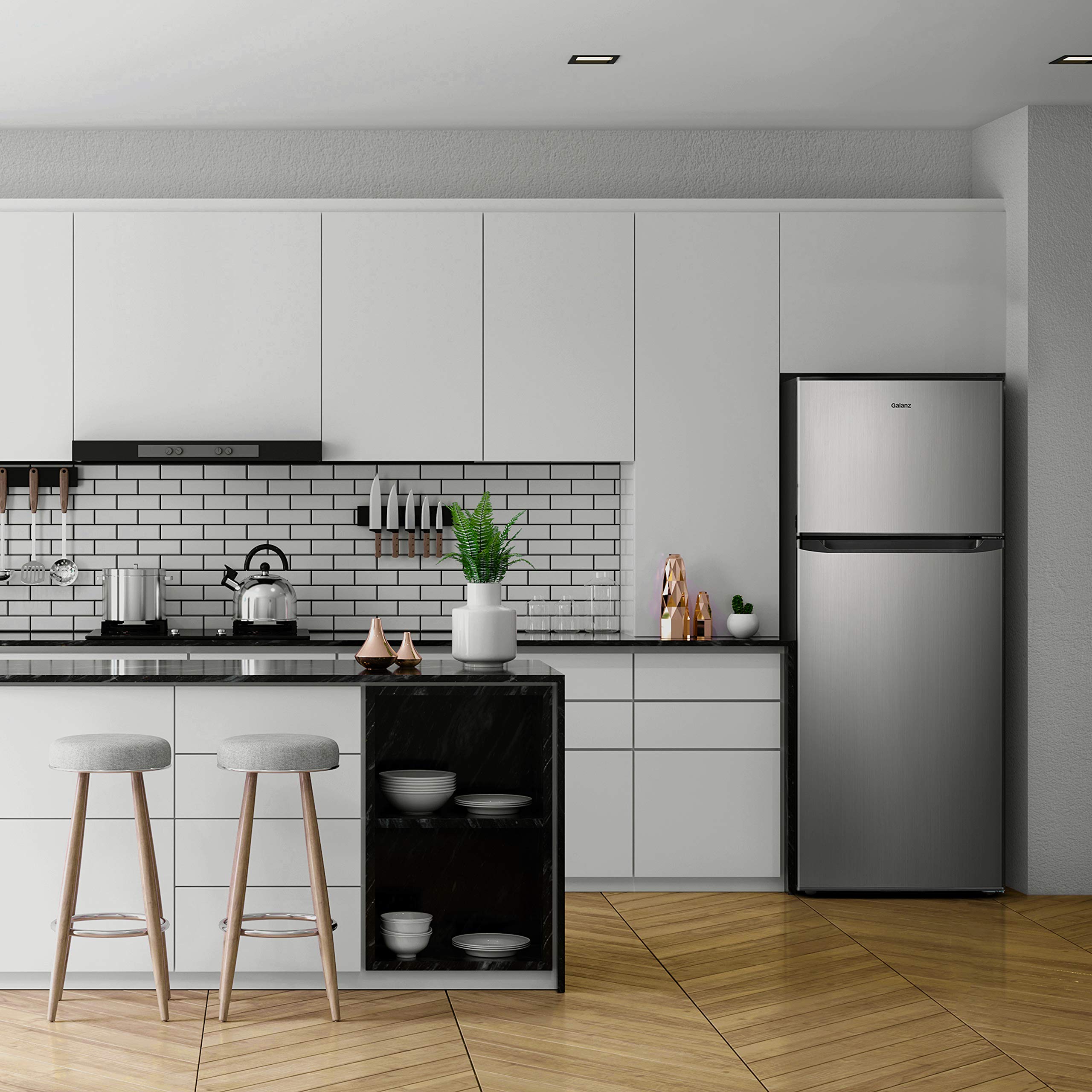 Product Features:Stainless Steel Look Frost Free/ Adjustable Electrical Thermostat Control,1 Crystal Crisper,1 Crisper Glass Cover,3 Full Slide Out Glass Shelves, Top Mount Freezer Compartment,2 Gallon Bottle Door Storage,6 Cans Dispenser,Interior LED Light,2 Leveling Front Legs. Specifications : Capacity: 10.0 Cu.Ft,Fresh food capacity: 7.42 Cu.Ft. Freezer capacity: 2.42 Cu.Ft,Voltage: 120Volts /60Hz,Annual Energy Consumption: 325 kwh,Installation Type: Free Standing. Package Includes:1 x Refrigerator,4 x Removable glass shelves,1 x Crystal Crisper,1 x Power Cord