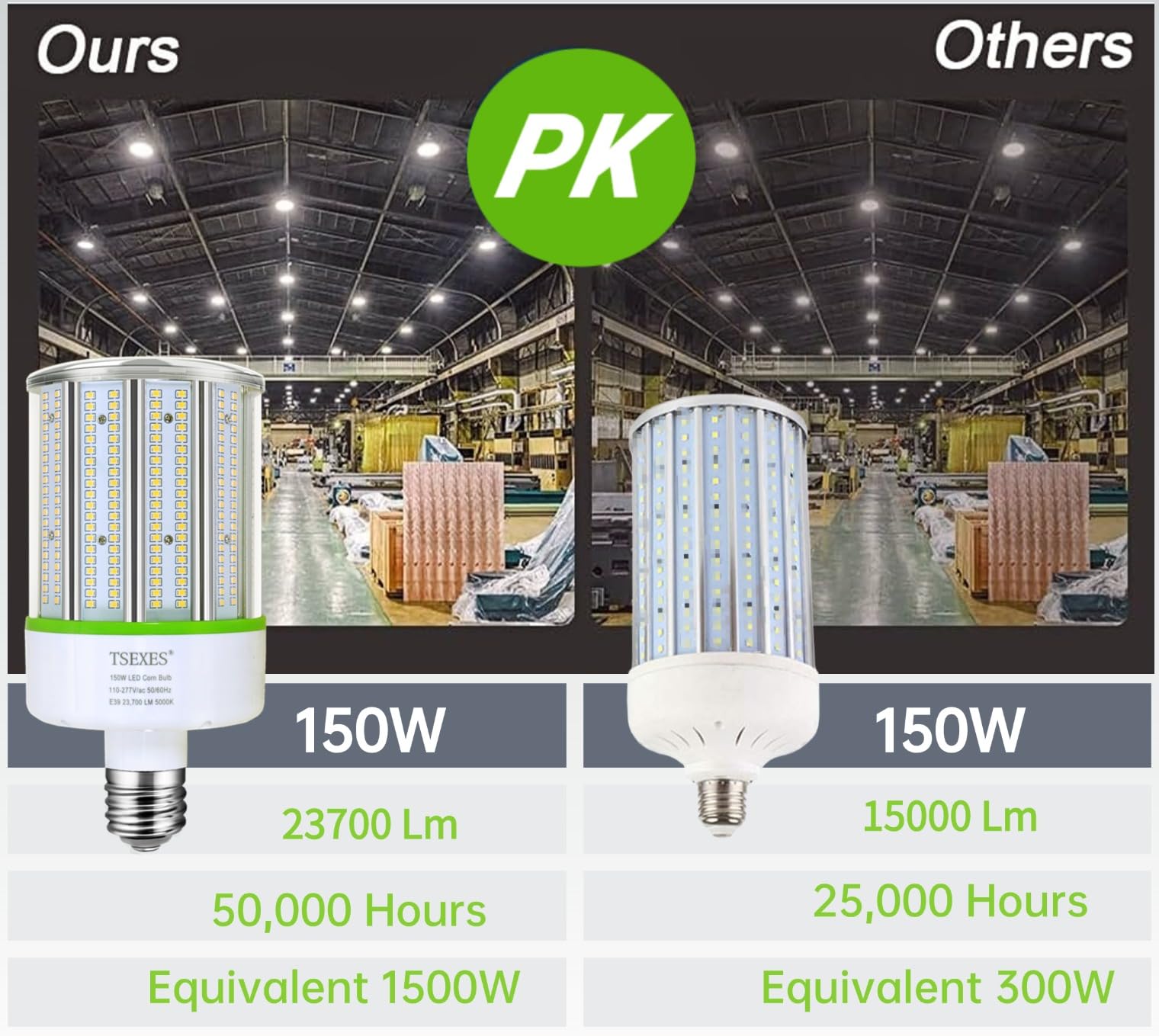 ✅Powerful Lighting: Our LED corn bulbs have a lumen output of up to 158lm/W,23,700 lumens of bright output, 5000K daylight suitable for warehouse lighting, high bay fixtures, garage workshops, and other large commercial spaces requiring powerful lighting.