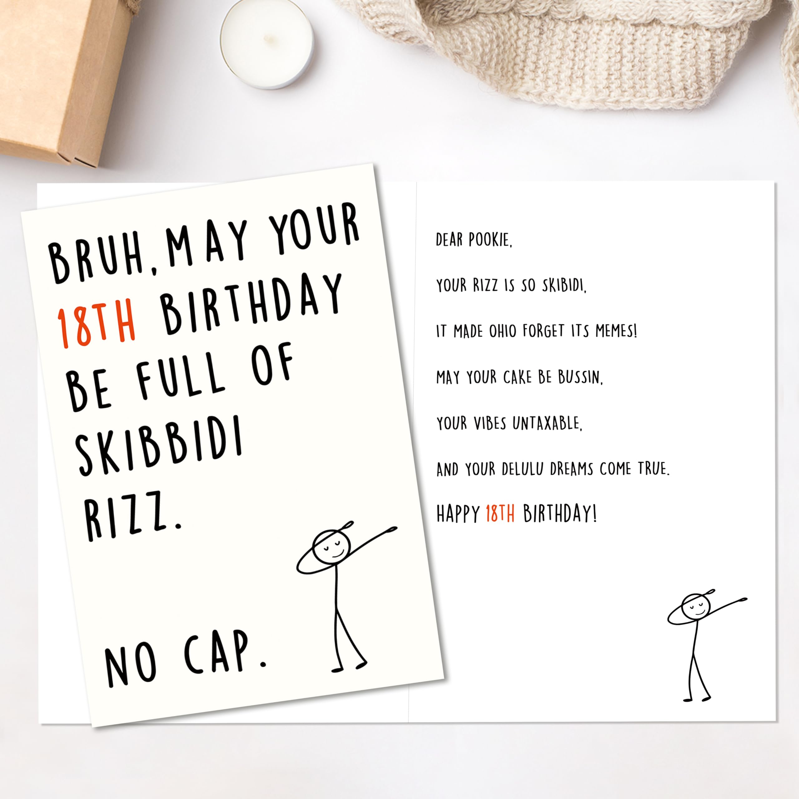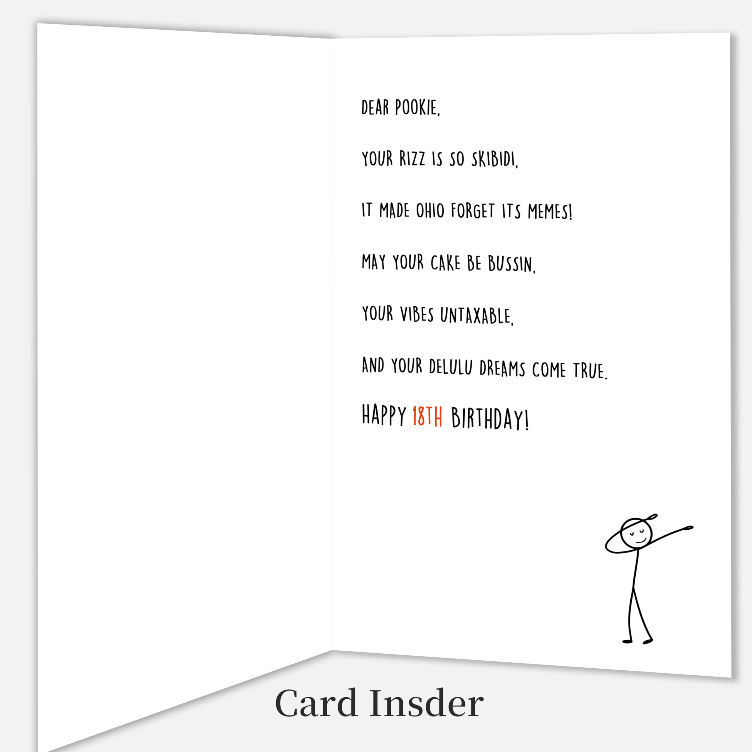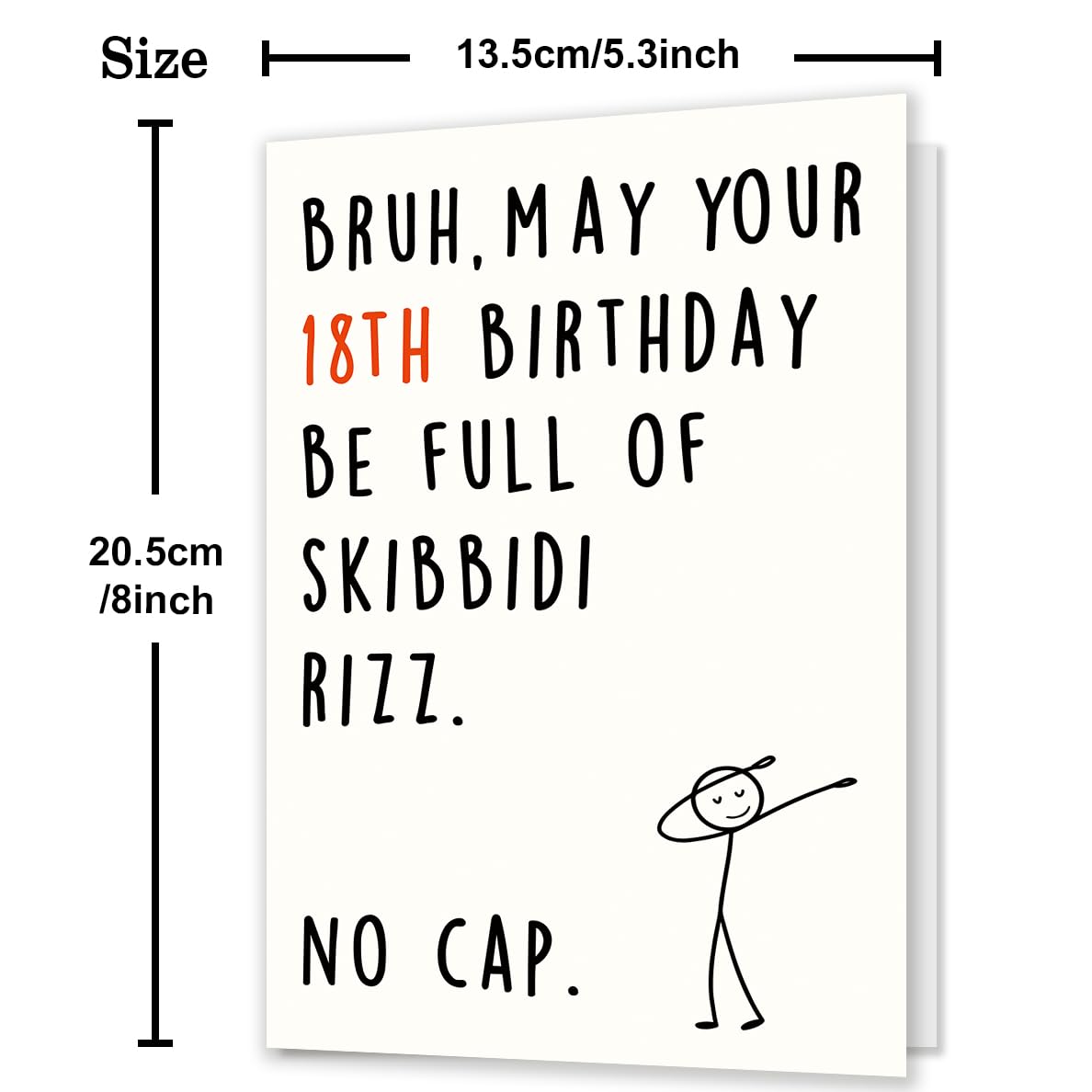 Funny 18th Birthday Card:Celebrate your teen's 18th birthday with this hilarious and trendy card! Perfect for expressing love and humor, it uses popular slang like "Skibidi Rizz" and "No Cap" to make the birthday kid feel seen and laughed with—a great way to show you’re in tune with their world. Perfect for making 18th feel seen and hyped on their big day!