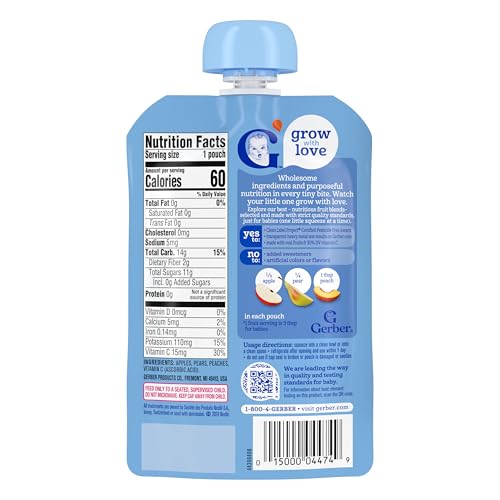 PUREED FRUIT: With your child in mind, our Gerber baby food offers a delightful blend of 1/3 apple, 1/4 pear and one tablespoon of peach in each pouch