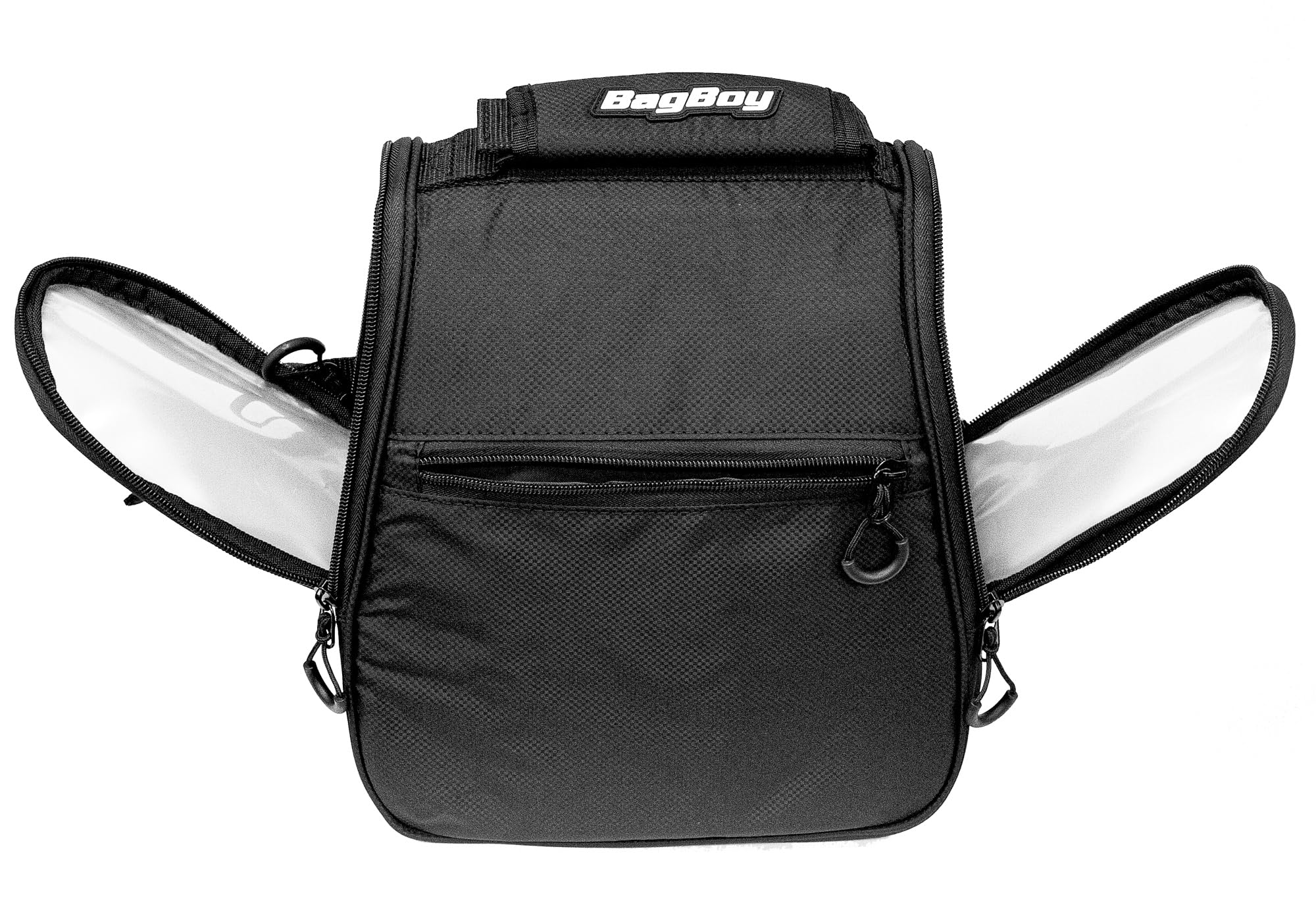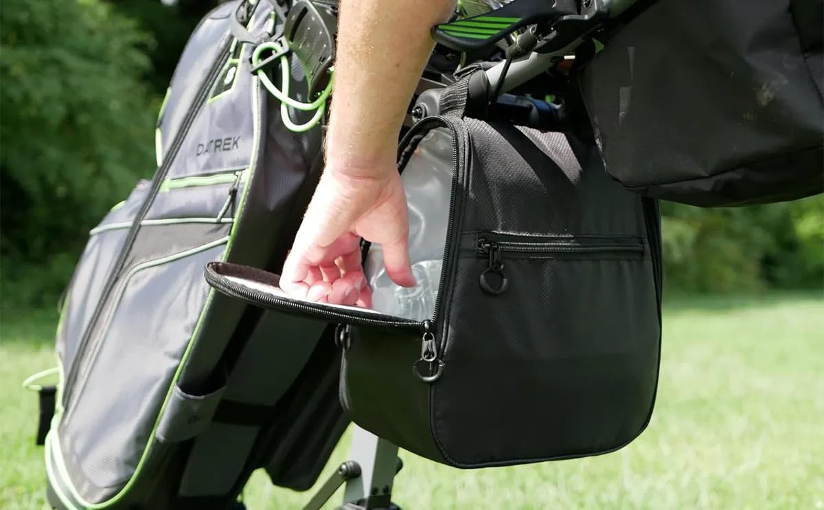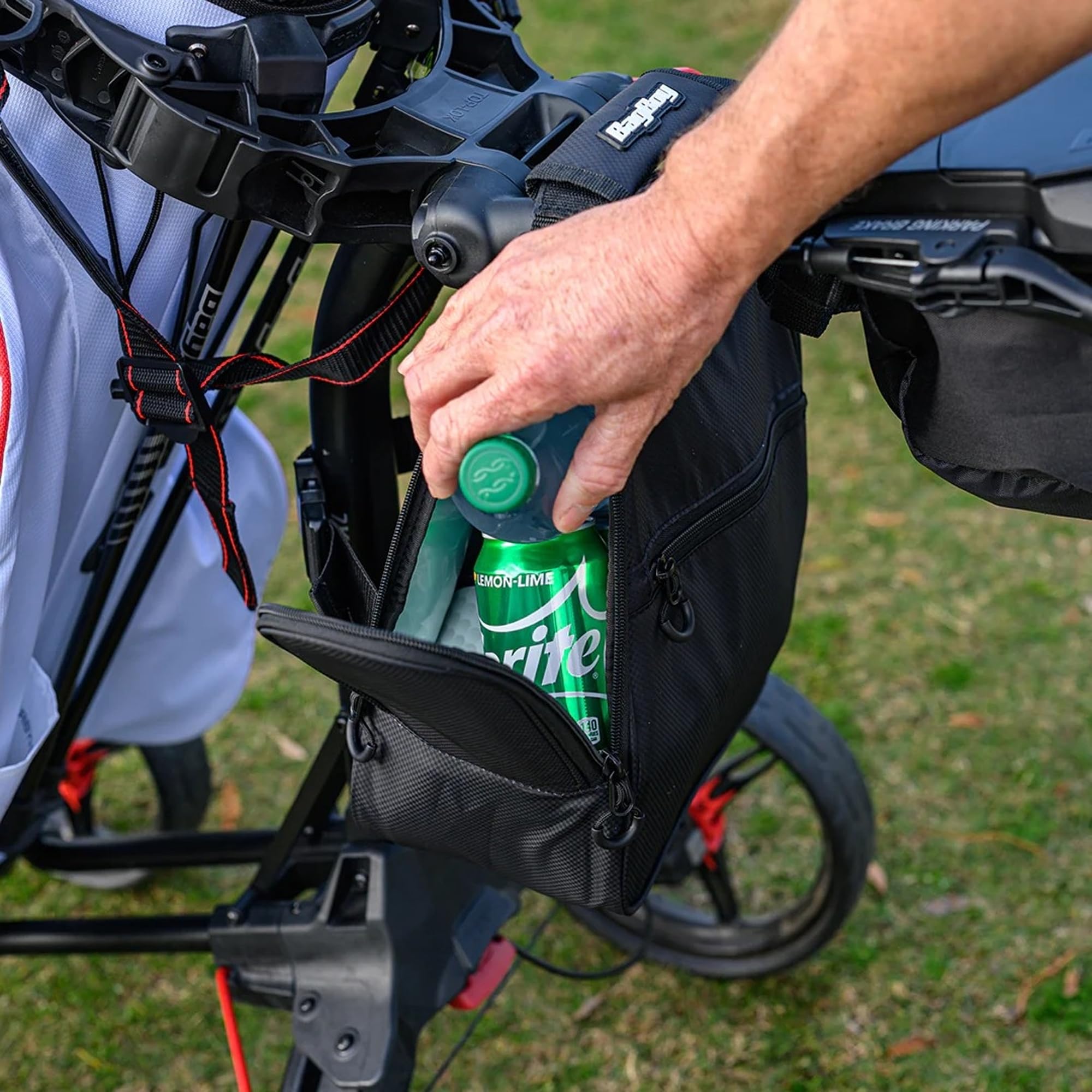 The Bag Boy cooler bag holds 12 12 ounce cans- specially designed to attach to the handle of your push or pull cart.