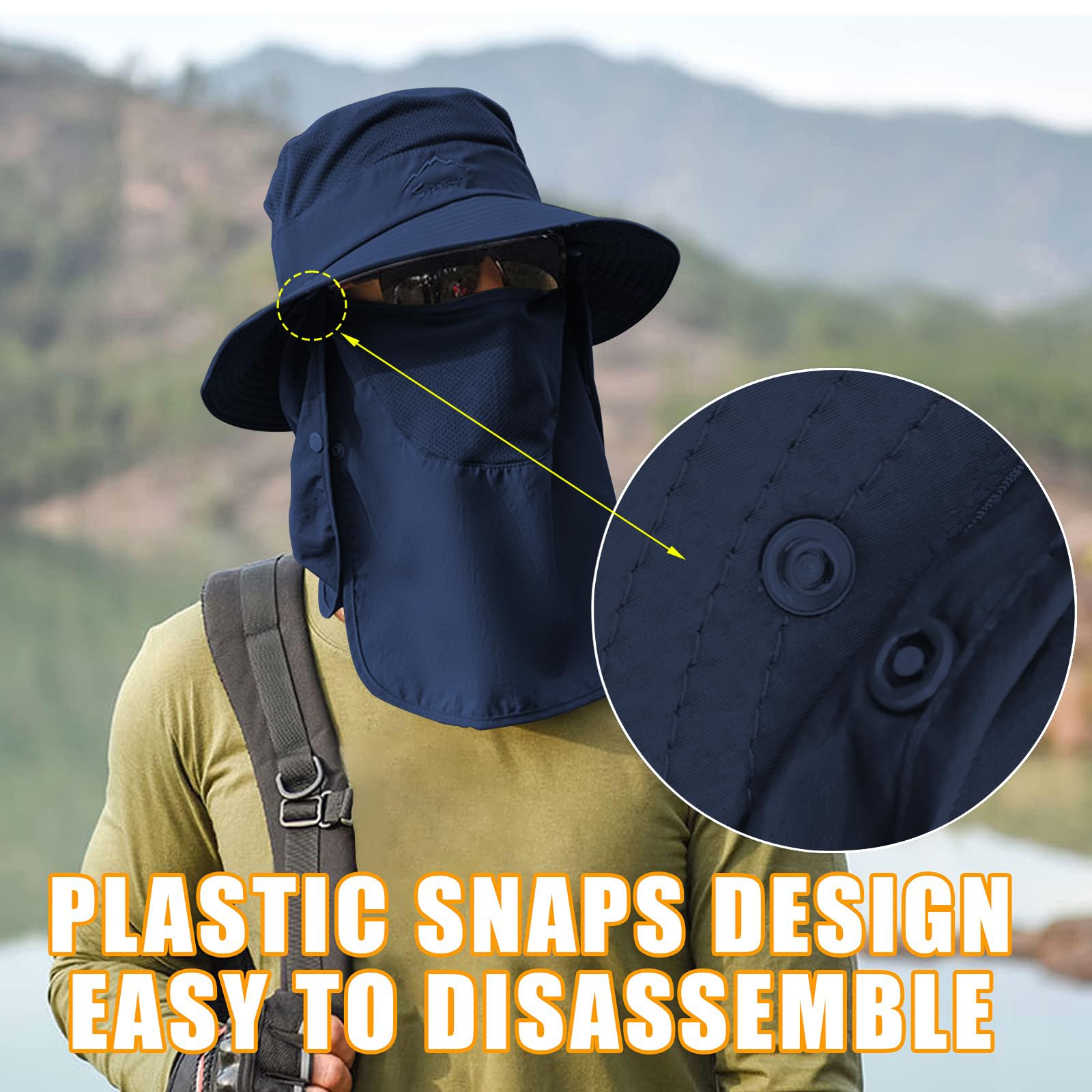 【Protection & Detachable】This sun hat combined with wide brim, face & neck flap (flap are removable) Which can keep the sun off your head, face and neck. adjustable chin strap to ensure that the hat can maintain comfortable conditions even in strong winds.