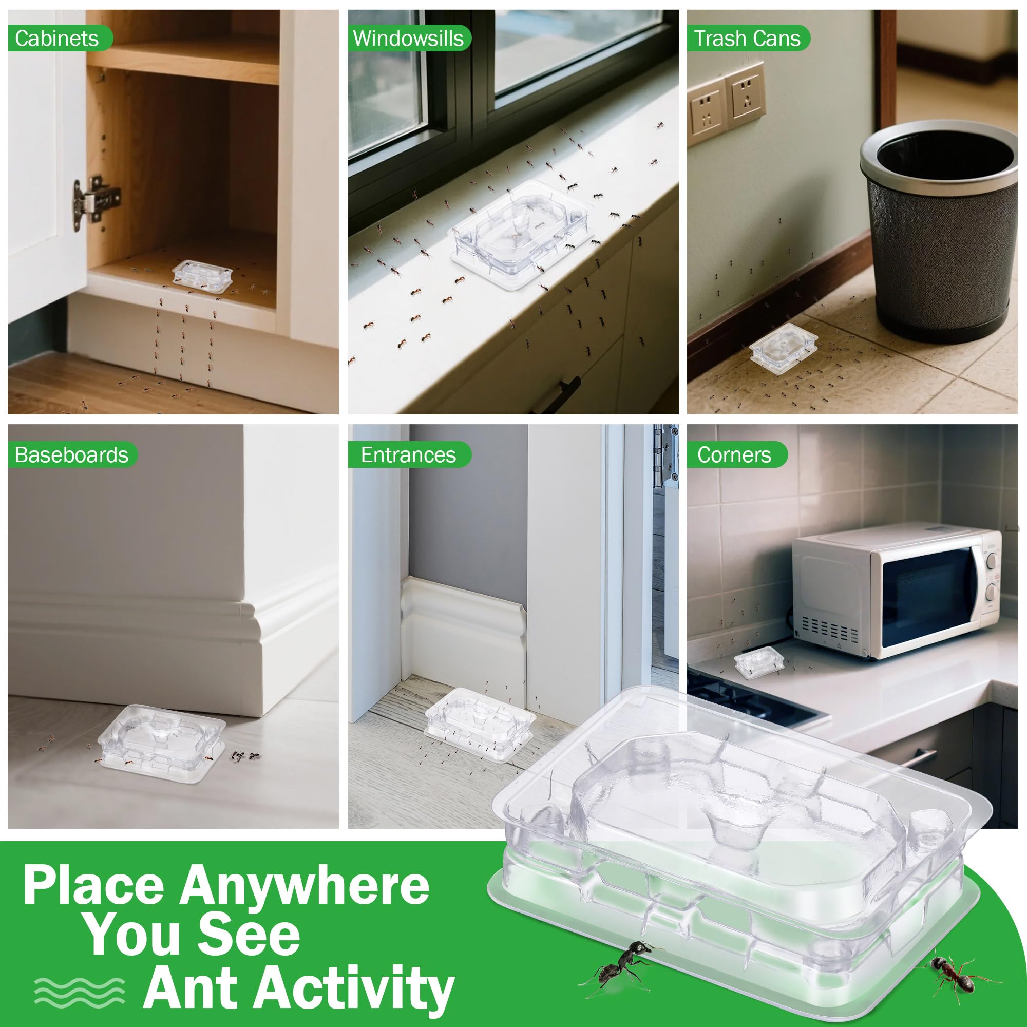 Kills the Colony: You will receive 16 sets of ant bait stations, which are sufficient and reusable to effectively control common house ants in your home, such as: Acrobat ant, Crazy ant, Sugar ant, Ghost ant, Argentine ant, Little black ants, Pavement, Odorous house, etc. Note: Liquid ant bait is not included