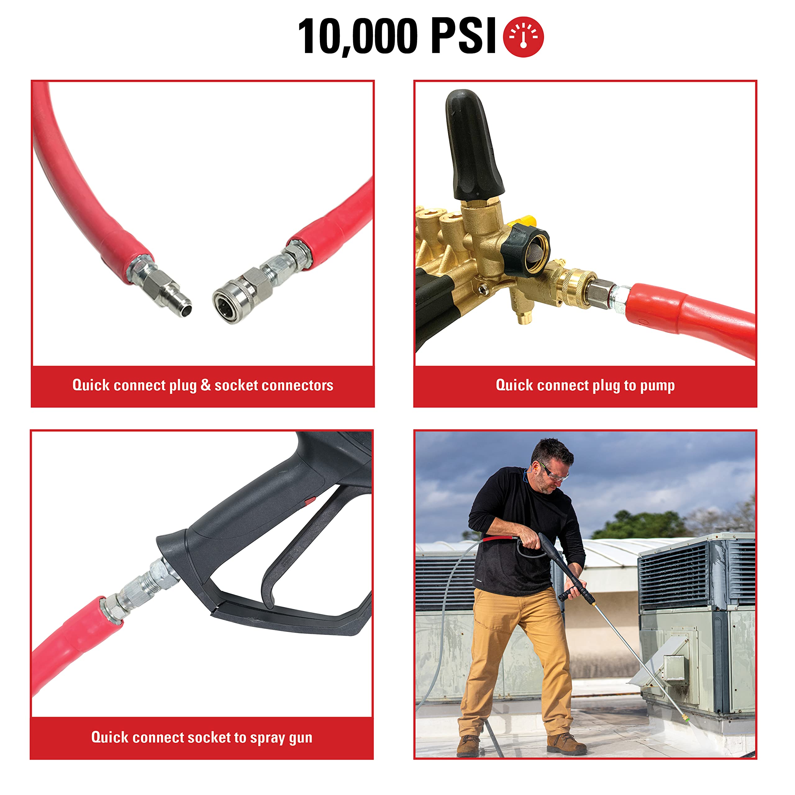 Easy Connections: This hose includes 1/2" Male quick connect plug x 1/2" Female quick connect socket hose connections, and can be used with pressure washers up to 10,000 PSI; Can be used as a replacement or as an extension to your existing hose