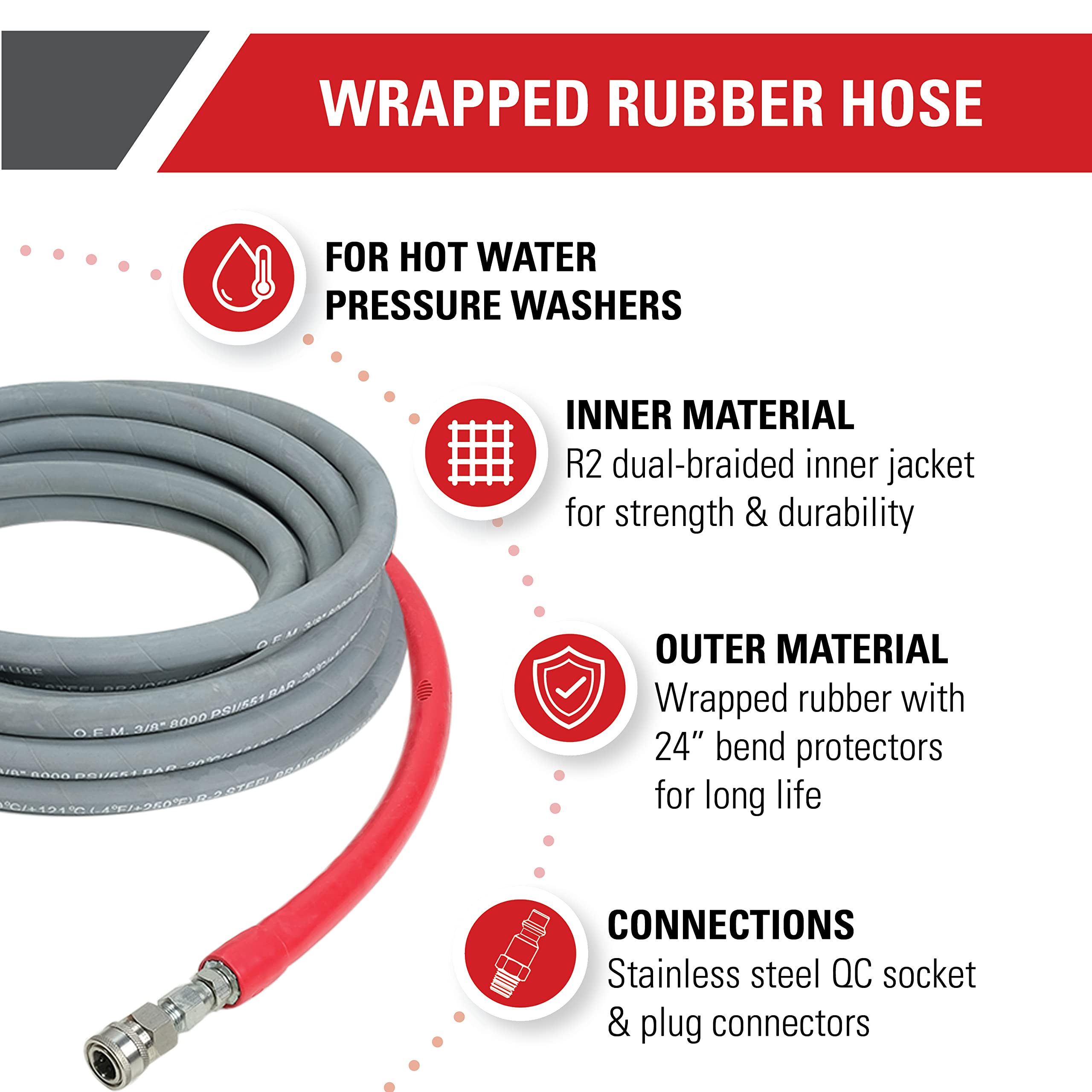 Hot and Cold Water Compatible: The Simpson Wrapped Rubber hose can handle hot or cold water; It is built for high temperatures up to 250° F; It's great for cold or hot water pressure washer projects to clean equipment, walls, vehicles, and more