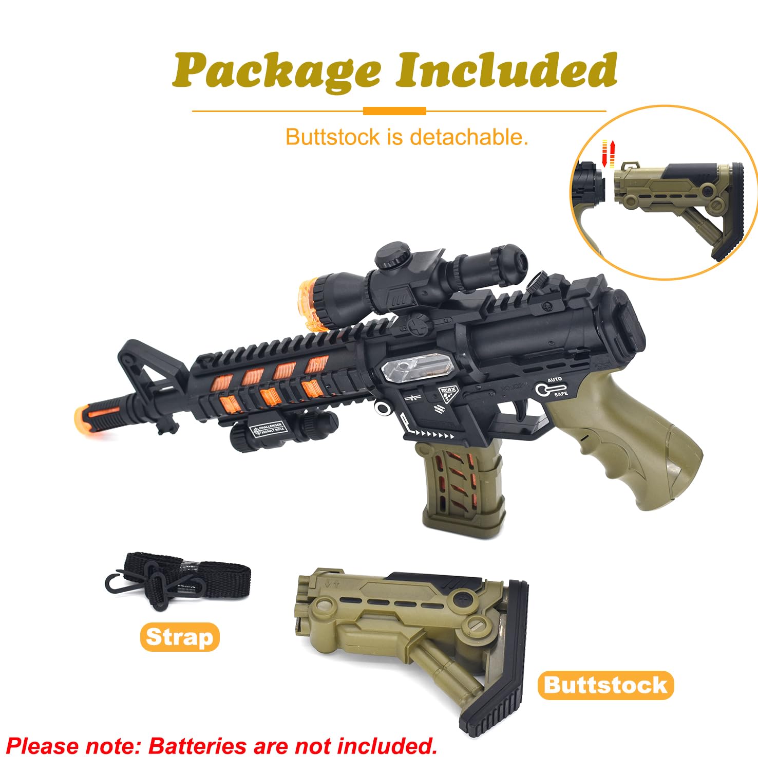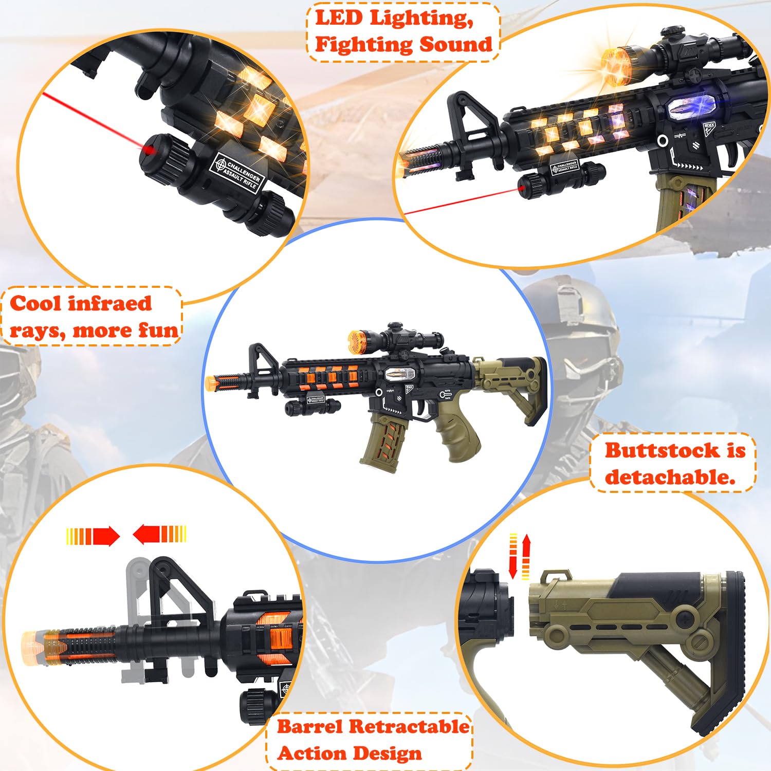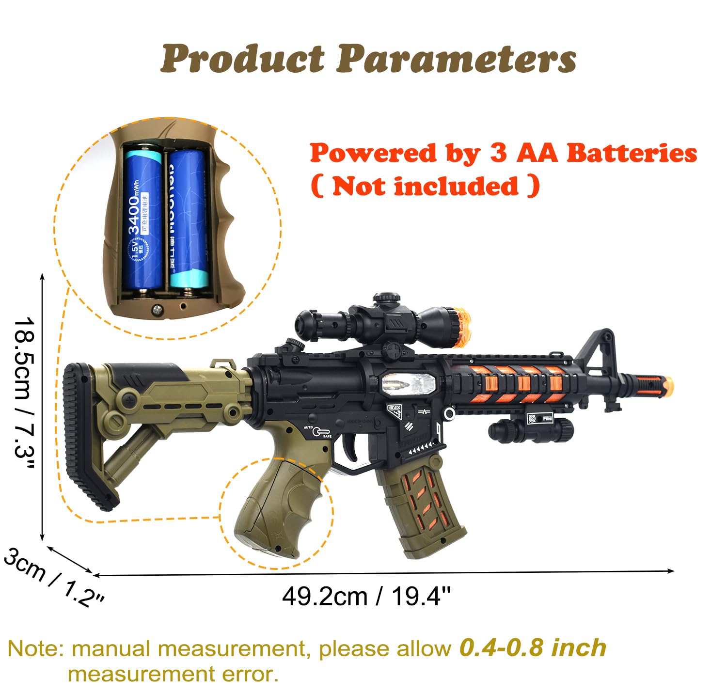 【Lights & Fighting Sound & Unique Barrel Telescopic Action Design】---This machine gun toy desgined with dazzling flashing LEDs Light & Soldier Fighting Pose and Fighting Sound that let them looks cool,and makes pretend play being a memorably exciting affair and much more funny.