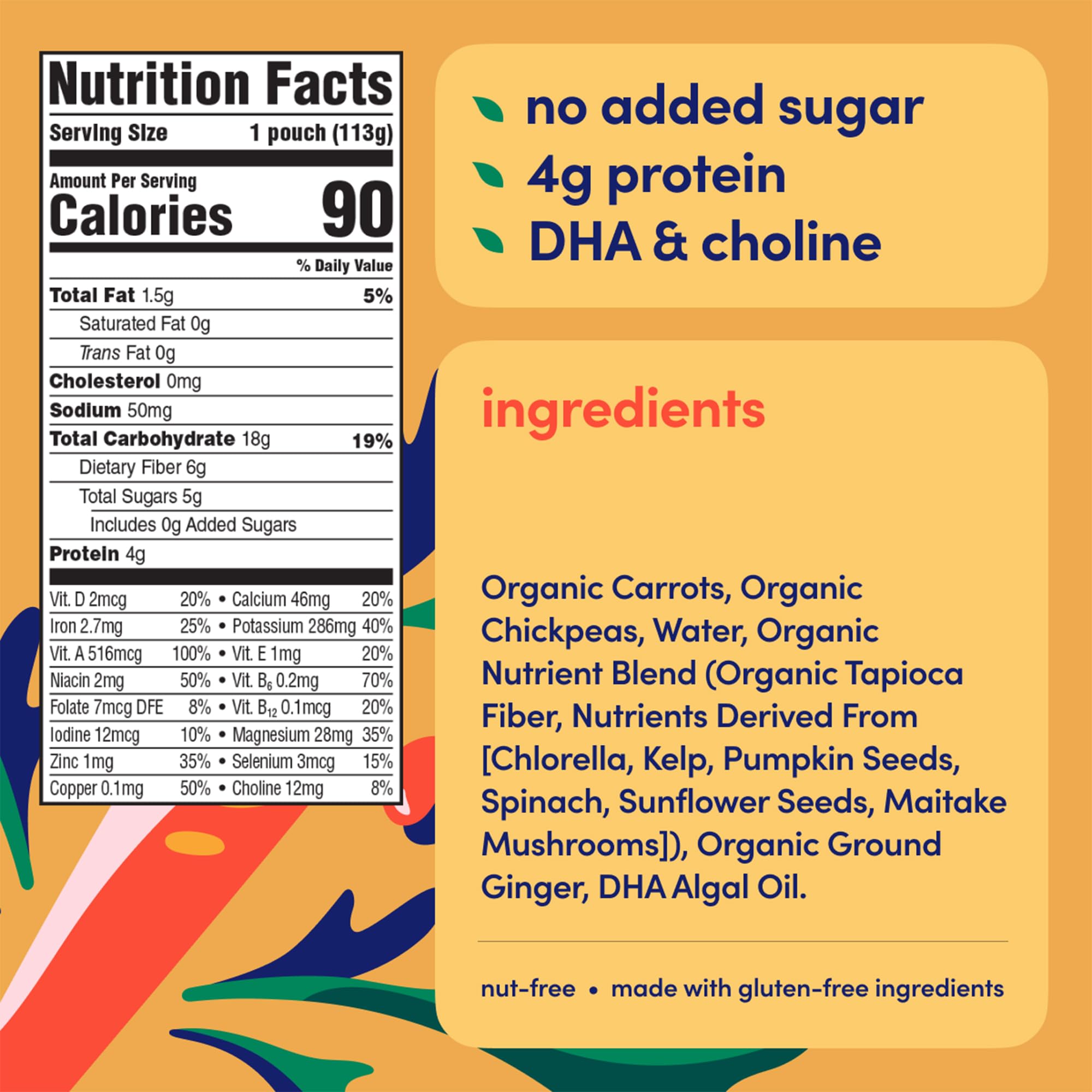 VEGGIE FIRST & NO ADDED SUGAR β Made with carrots & chickpeas, no added sugar, gluten, dairy or nuts