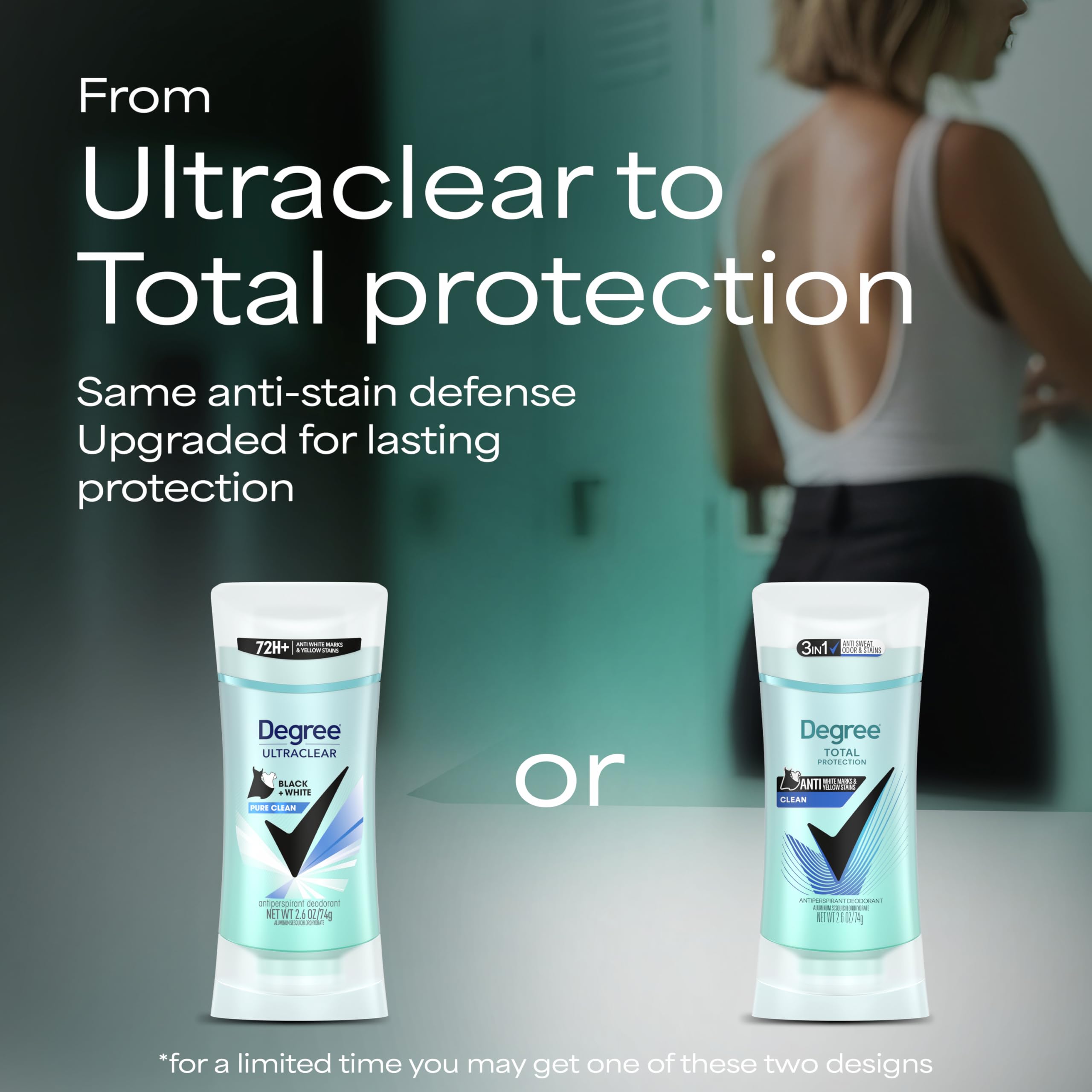 Degree is upgrading to our best formula yet. Our new and improved formulation gives you 72 hours of nonstop sweat and odor protection. You will still find all the same fragrances you know and love, but now with our new and improved long lasting protection. For a limited time, you may still receive our old 48-hour formulation while all our new 72-hour products make their way to a store near you. With no white marks on black clothes and no yellow stains on white clothes, you’ll look great and feel confident that you're protected from deodorant stains, sweat and body odor. Degree antiperspirant deodorant UltraClear Black+White has a breakthrough formula that cuts down on the stains that some other antiperspirants leave behind when they mix sweat and natural oils produced by your body. With a Pure Clean fragrance, expect a fresh and airy fragrance with a clean feel. This deodorant for women is the perfect way to start your day, and also for those moments throughout your day when you may need freshening up Only Degree has a unique MotionSense technology that keeps you fresher the more you move.